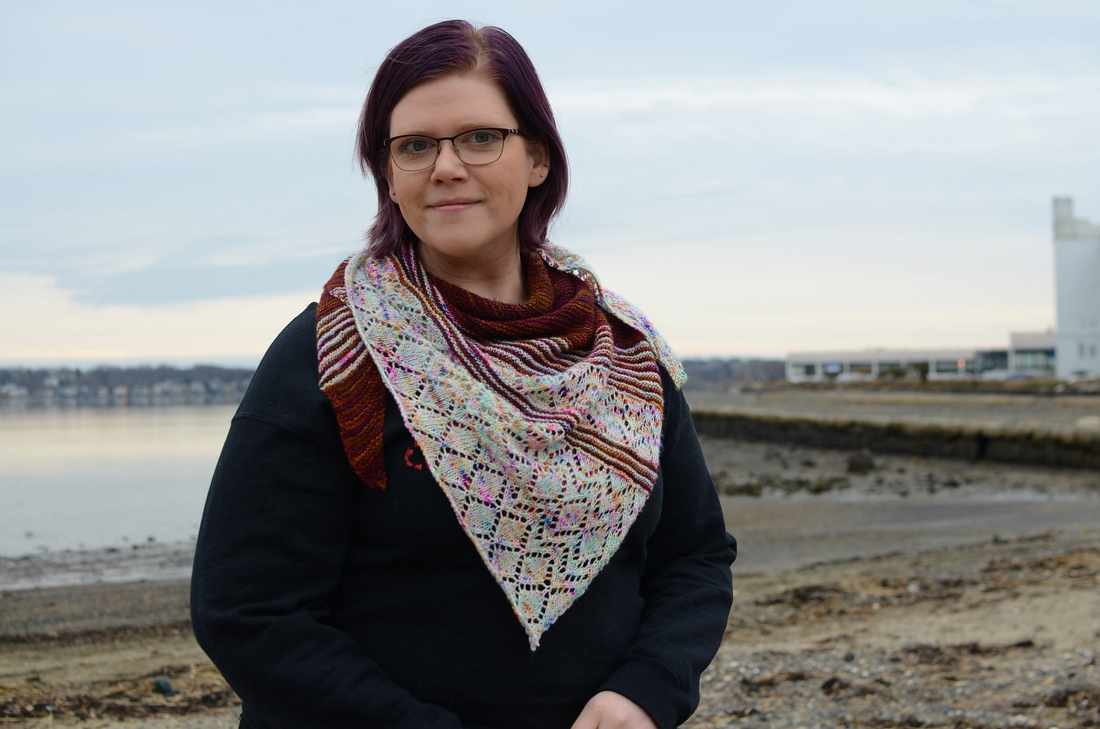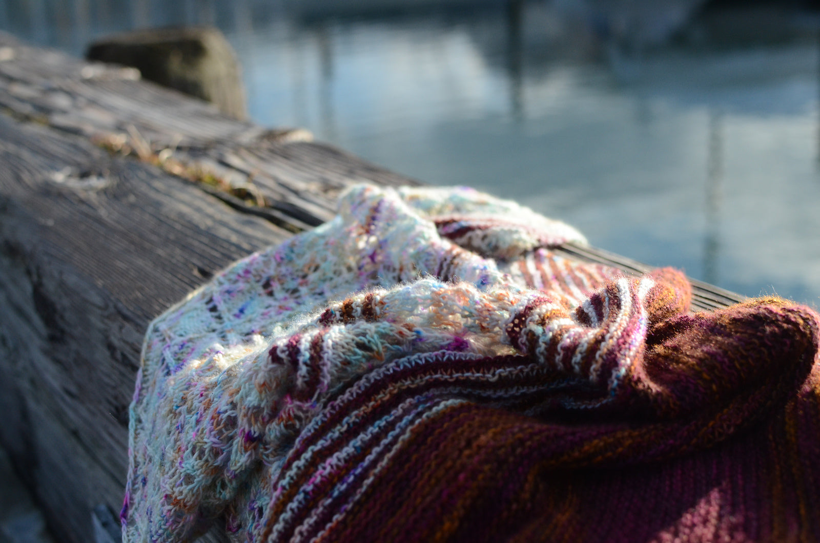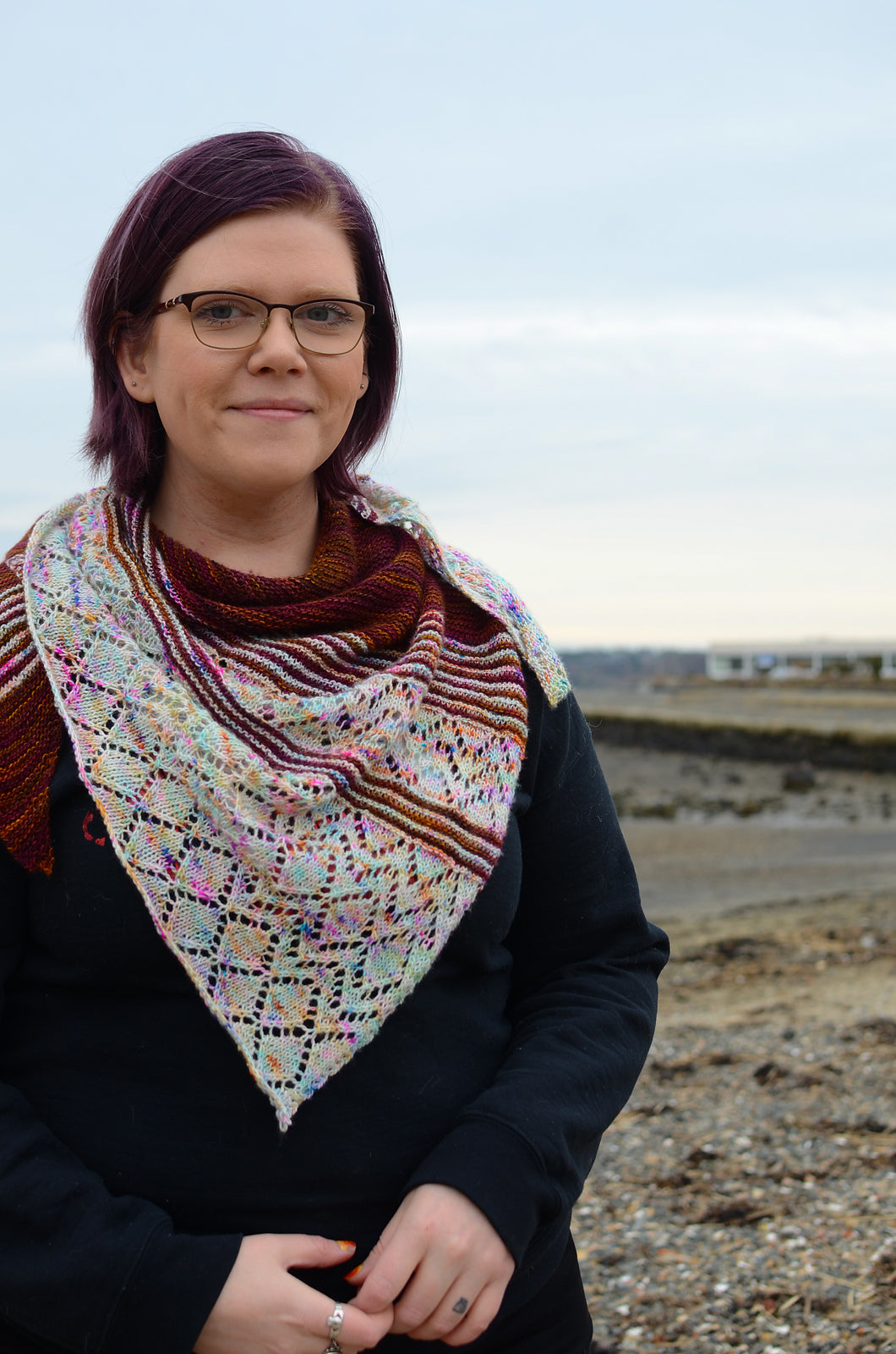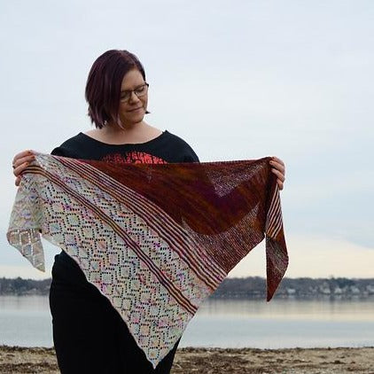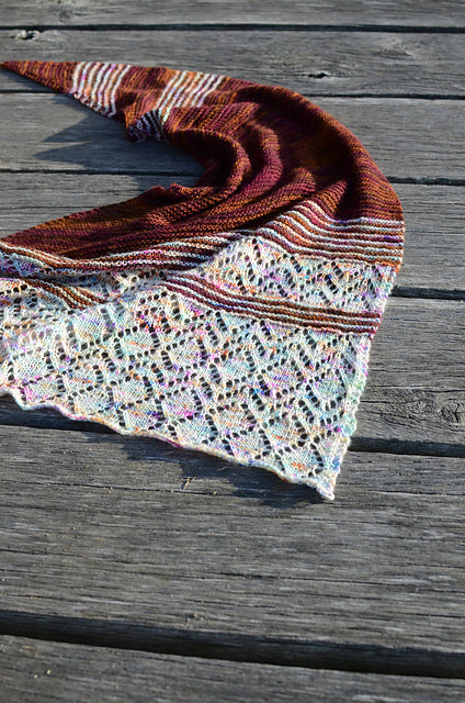 This shawl is knit on the bias. Pick colors in the same family for a “fade” effect, or use contrasting yarns for bold stripes!