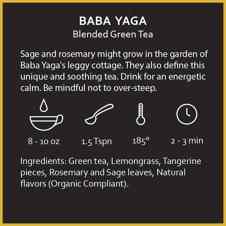 Sage and rosemary might grow in the garden outside or hang drying within Baba Yaga's leggy cottage. They also define this smooth and soothing Green tea that gives a gentle energic kick while also providing some calming herbal effects. Be mindful not to over-steep.
