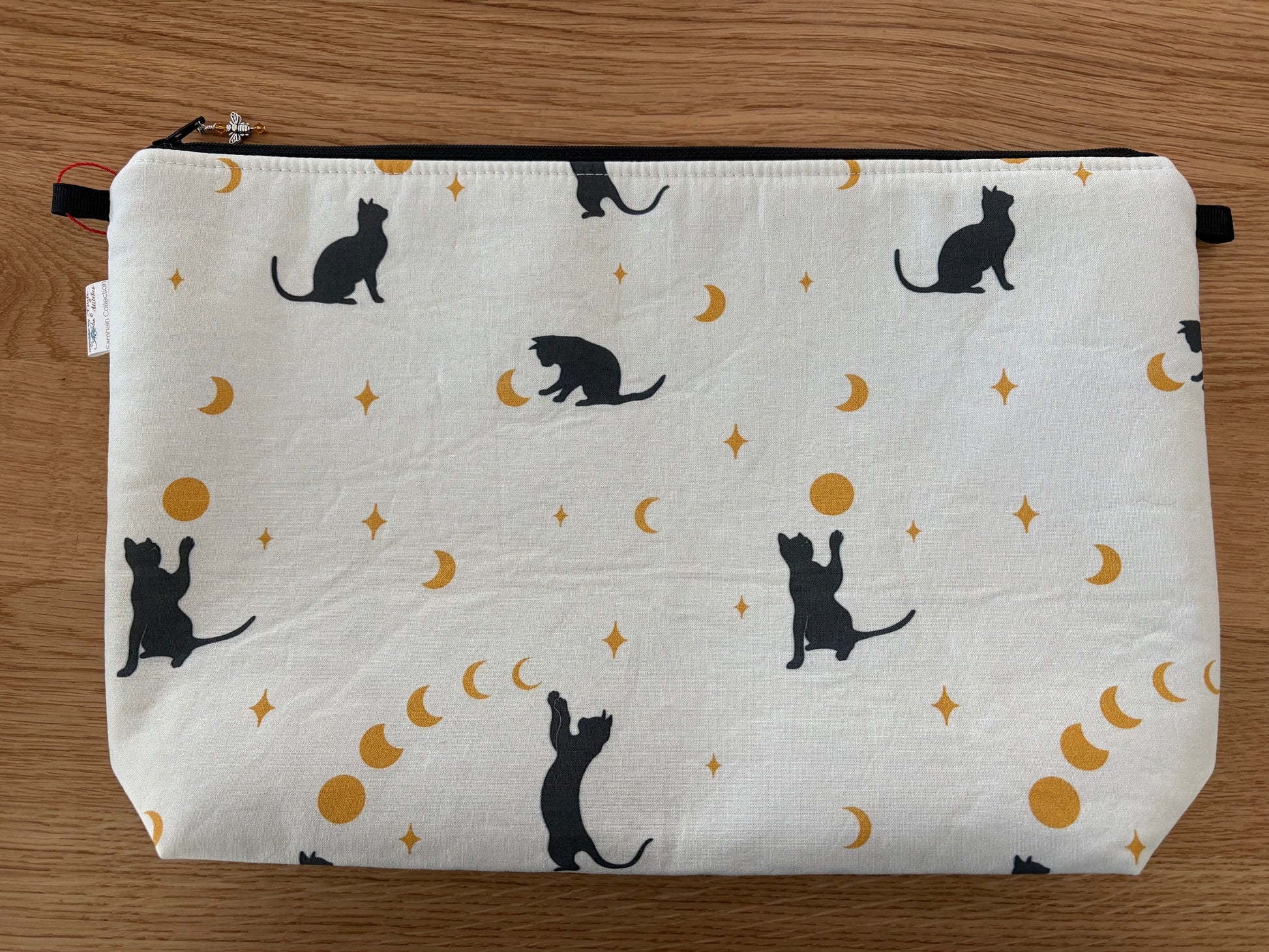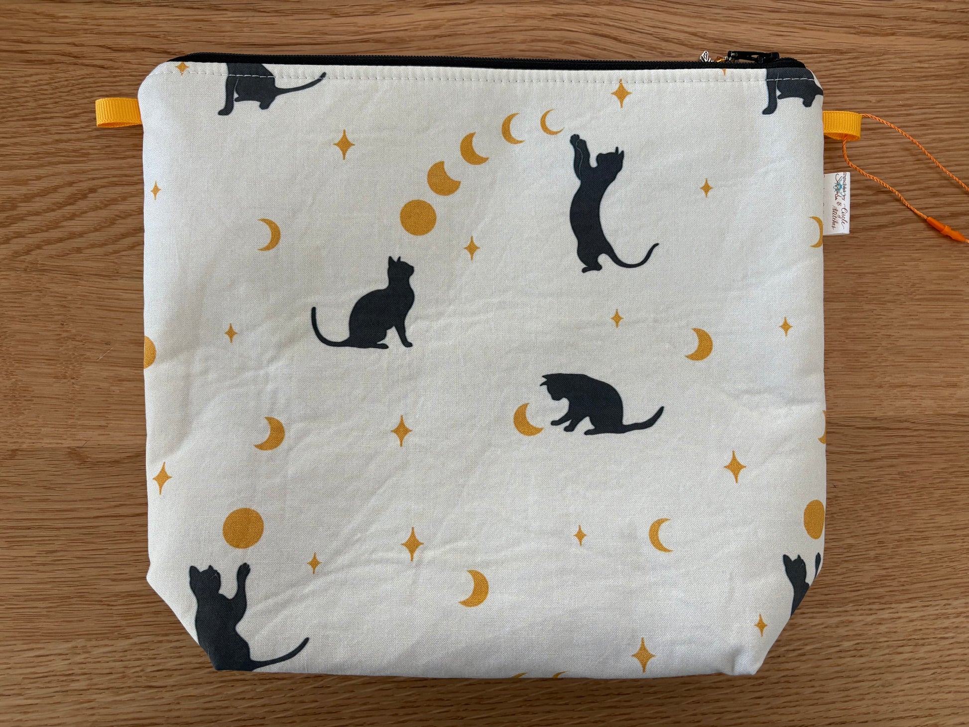 A project bag sewn for you! This mystical cat themed Stitched by JessaLu Project Bag Knitting Bag (or a purse or a lunch bag or a makeup bag - there are no limits) is a perfect size to hold your sock-in-progress, shawl-in-progress or any other medium sized project - it also works well as a wristlet purse!
