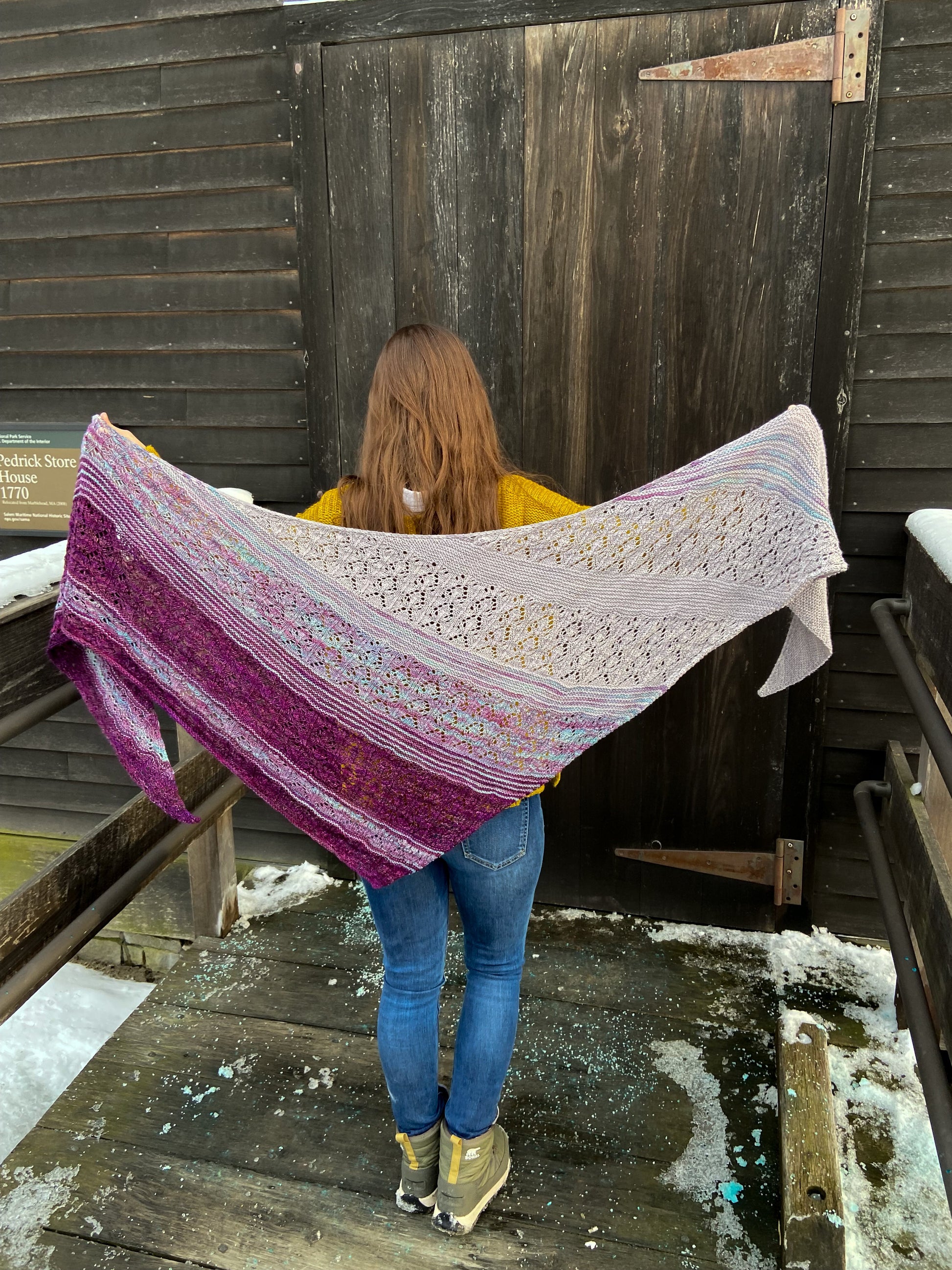 Diamond Dust is an asymmetrical triangular shawl knit on the bias with a soothing balance of meditative garter stitch and intuitive lace. Pattern is both charted and written.
