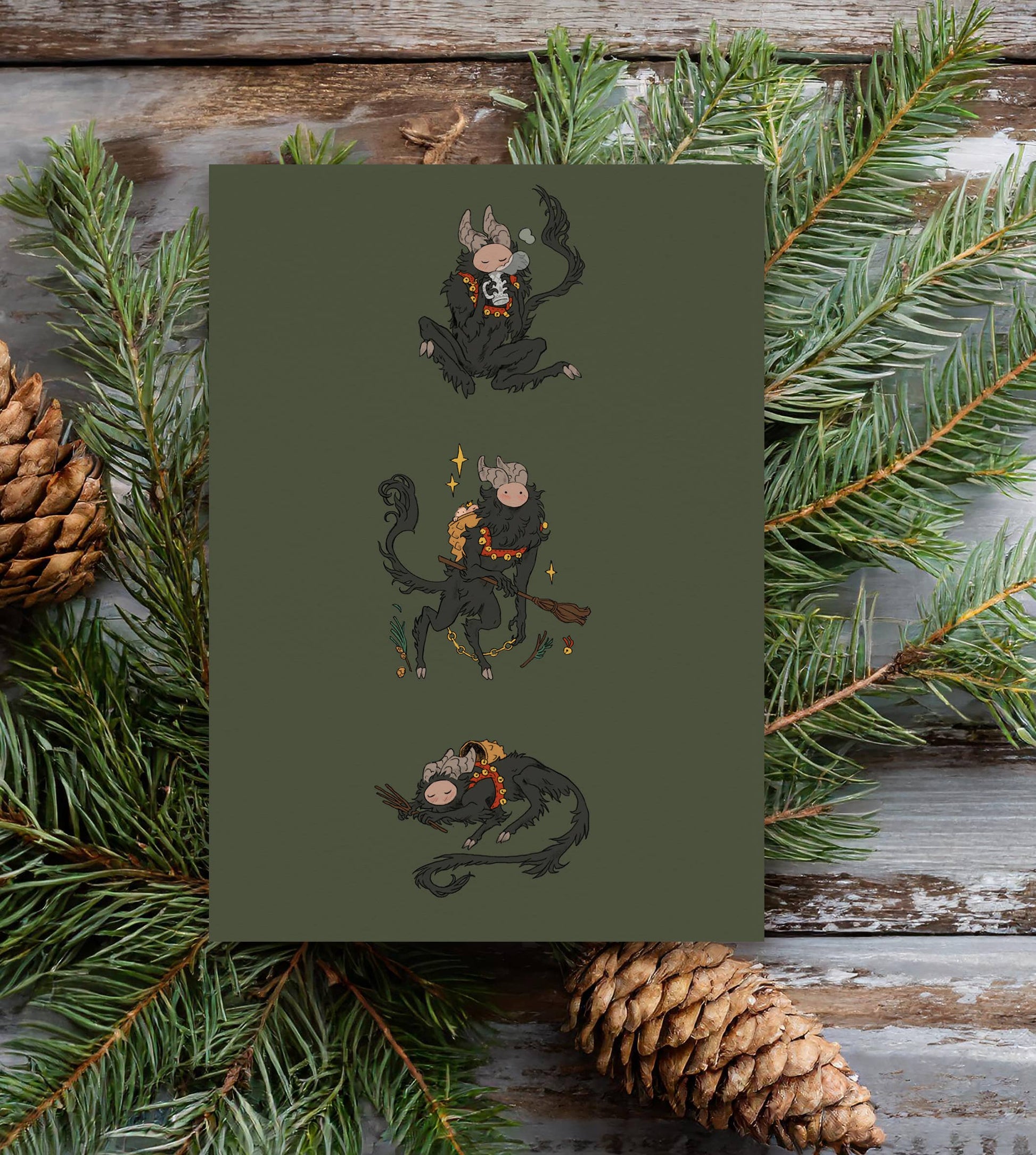 Little cozy Krampuses on a green background. Designed by the Winter Den here in Salem!