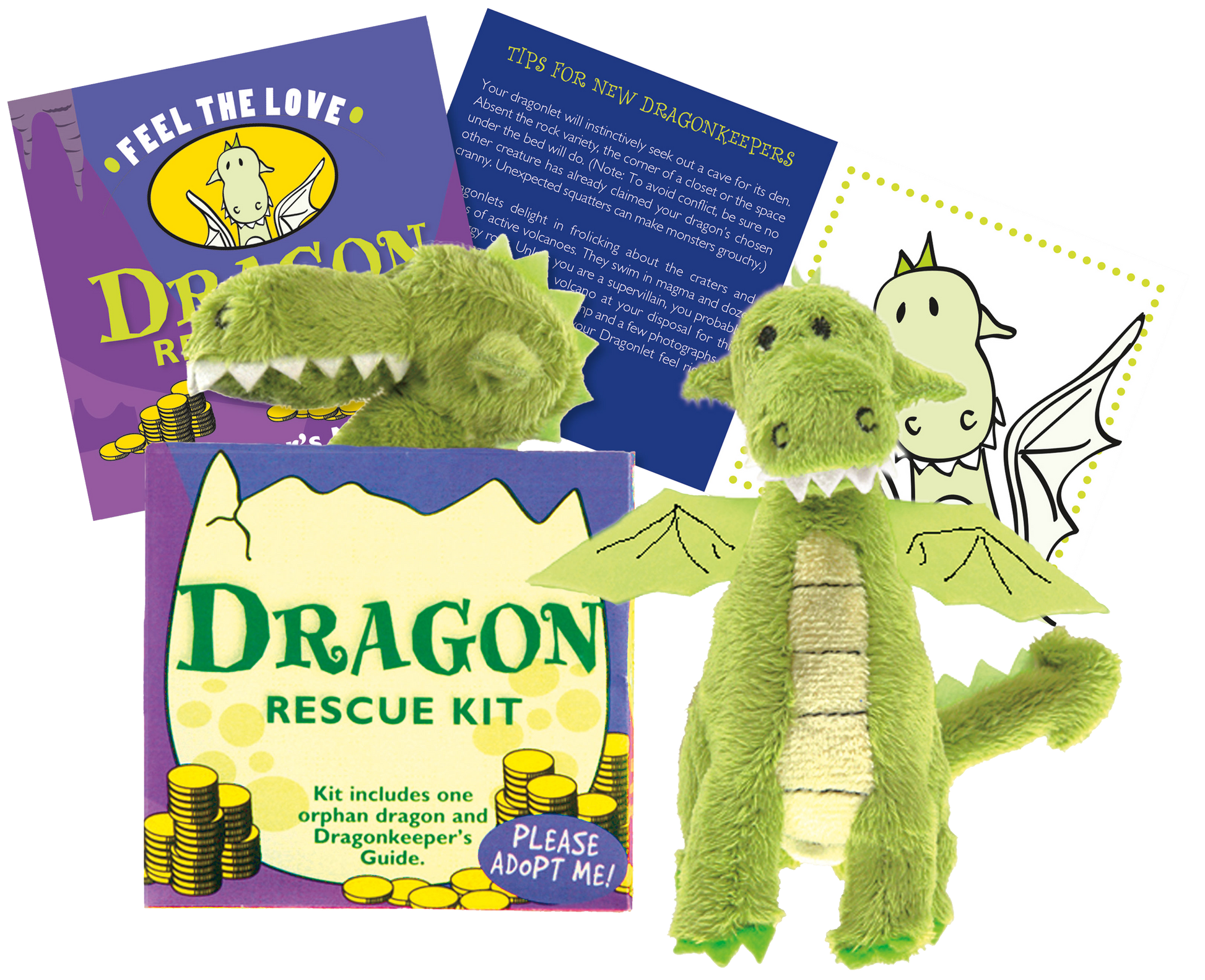 Tiny dragonlet emerged from its egg all alone in the world. It needs a guardian -- like you! -- to teach it the finer points of flying, gold-hoarding, and toasting marshmallows with its breath. Baby dragon measures just 5 inches tall and is soft and cuddly. Rescue Kit includes one plush orphan dragon and ''Dragonkeeper's Guide,'' which includes adoption certificate and advice for rearing your fiery friend. Learn fun facts about dragon history and dragon lore, and everything you need to know about raising a dragon, from flying lessons to the perils of dragon sneezes..