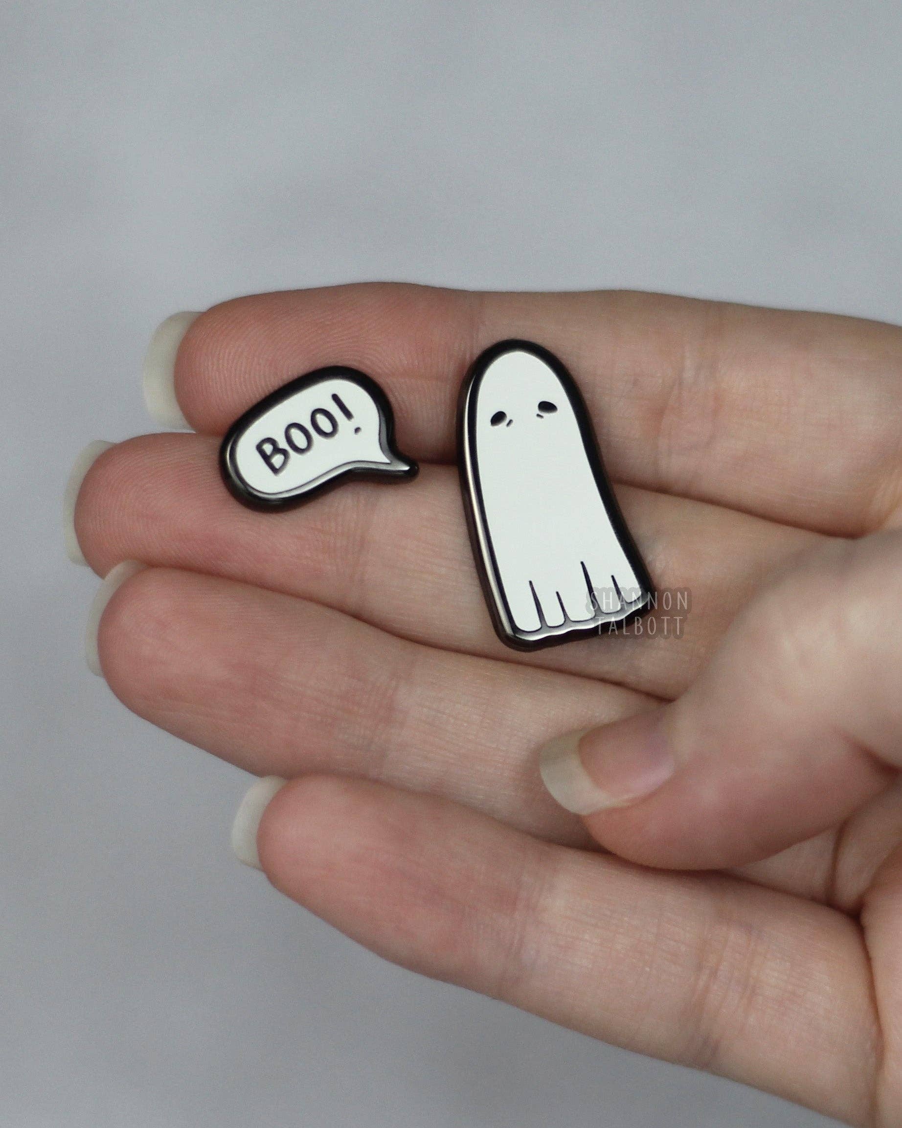 Boo! Ghost Enamel Pin Set Details: ✦Hard enamel pin set ✦Ghost pin is 25mm tall ✦Black Nickel plating with glow in the dark enamel ✦Rubber clutches on back ✦Shipped with a backing card