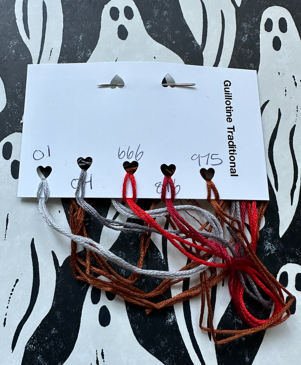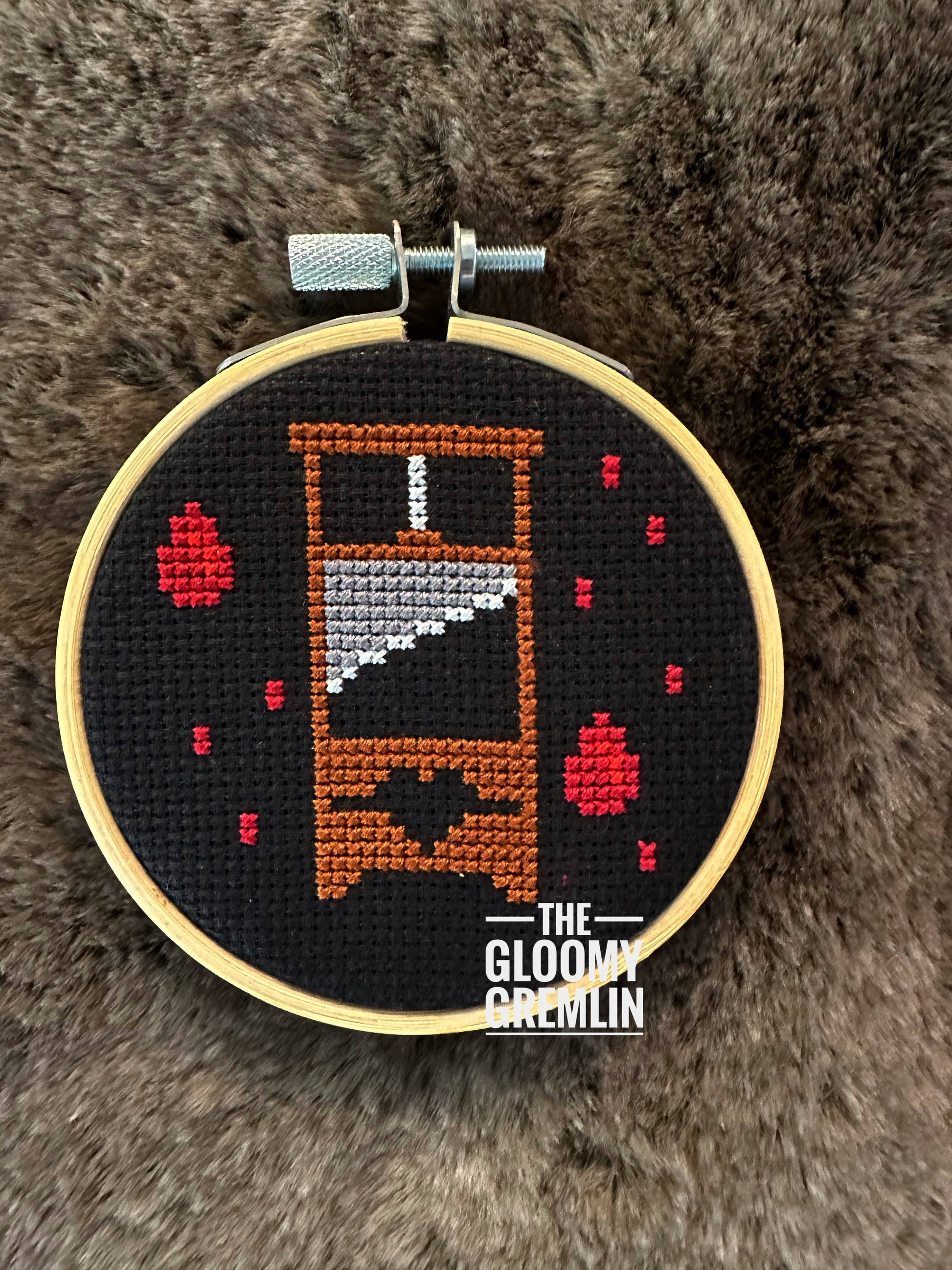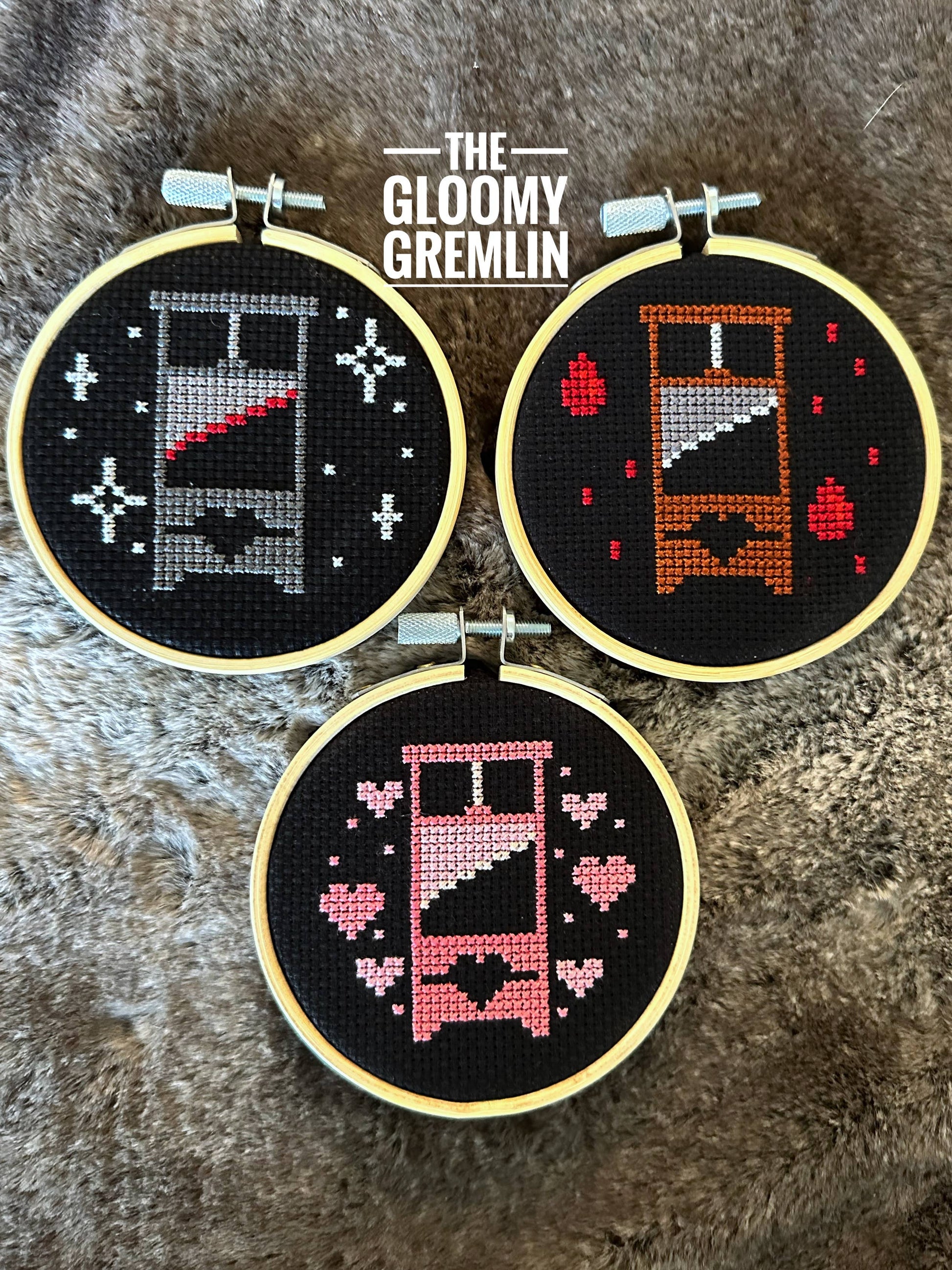 All The Gloomy Gremlin cross stitch patterns are hand-drawn, and personally test stitch every one. Each kit comes packaged in a purple 6 x 9 envelope, and includes the full color cross stitch pattern, a beginner cross stitching guide, 14 count black Charles Craft aida fabric, DMC embroidery thread, an embroidery needle, and a 3" embroidery hoop.