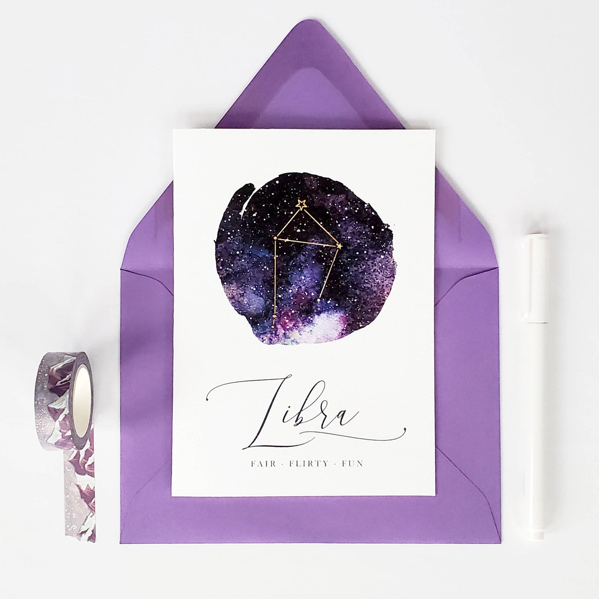 The perfect astrology birthday card for the Libra in your life. Lucky Dog cards are hand-folded and printed on thick, felt-textured stock to create a unique and memorable stationery experience.
