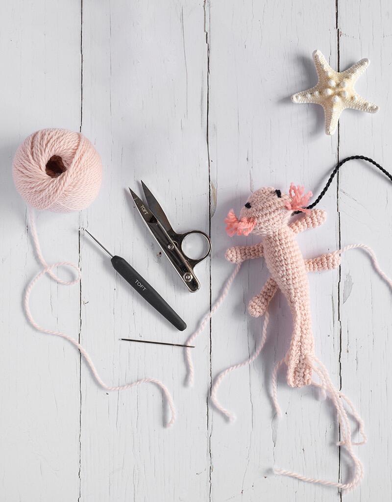 Perfect for pet lovers, this adorable scaled-down version of Danielle the Axolotl joins Kerry Lord's mini menagerie. Part of the salamander family, legend has it the axolotl is in fact Xolotl, the Aztec god of fire and lightning, who disguised himself as the creature to avoid being sacrificed. The ability to regenerate lost limbs adds to their otherworldly qualities, along with the fact that they never outgrow their juvenile stage of development. With their feathery gills and sweet little smiles, it's no wonder axolotls are so appealing to people around the world – and this woolly version captures this cuteness perfectly. Even better, when purchasing this as your next project there's enough yarn included to make two mini axolotls by reversing the colours!