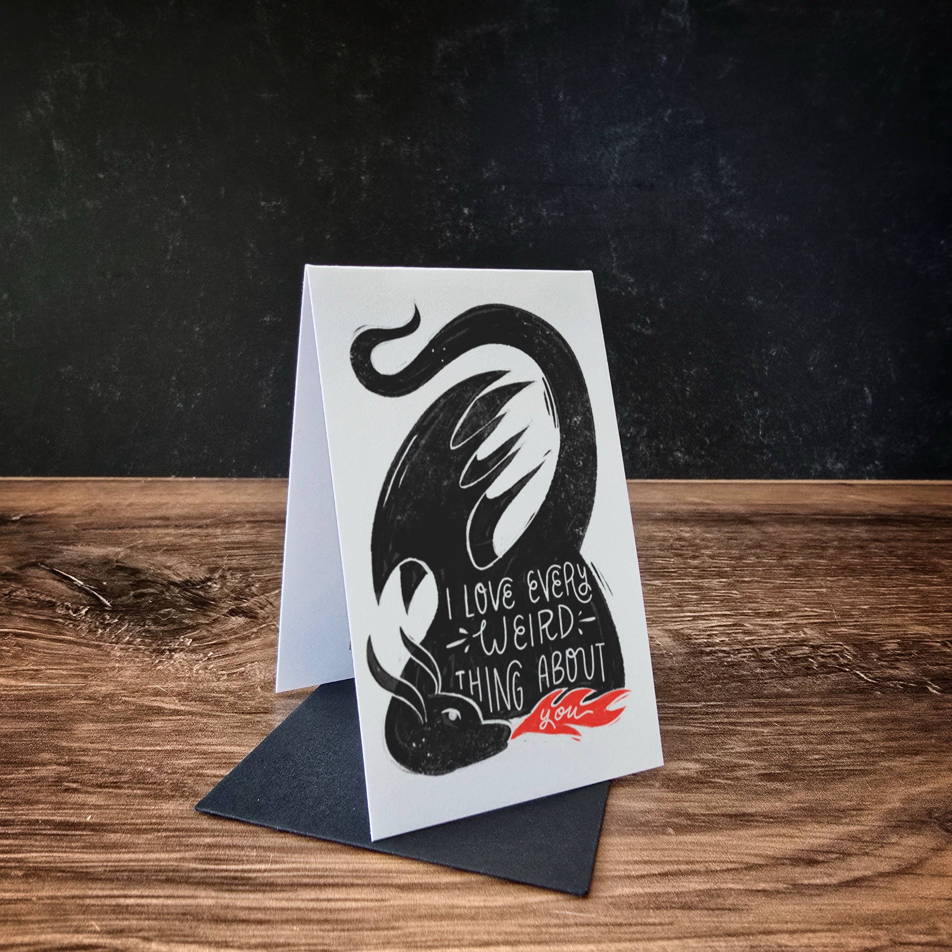 Mini Greeting Card: I Love Every Weird Thing About YouA tiny Merry Witchmas card! Inspired by the lore of Baba Yaga. Dimensions: 2 x 3.25 inches when folded