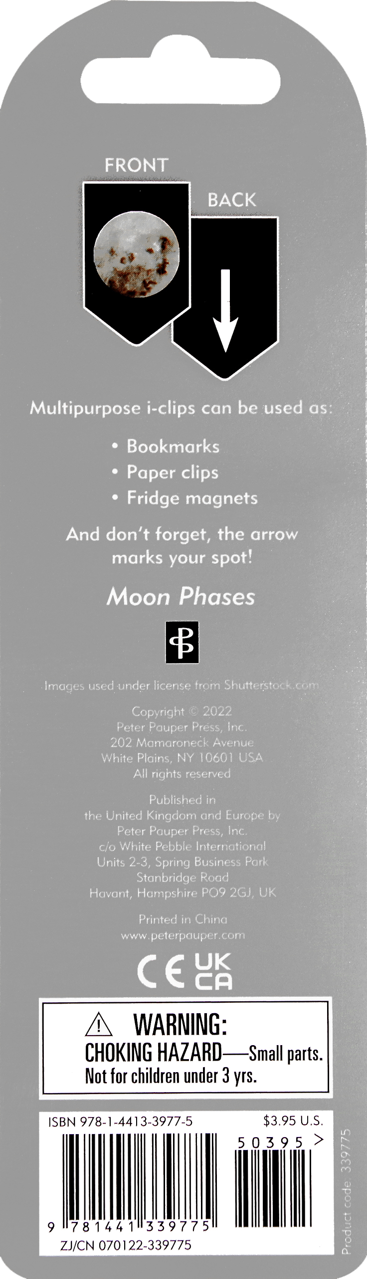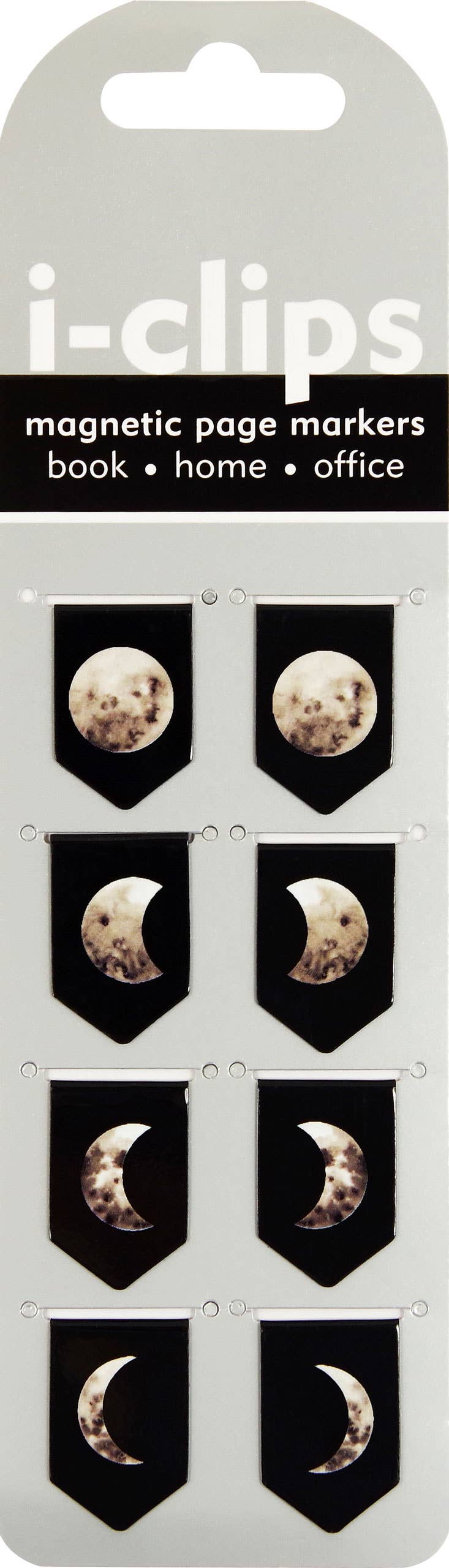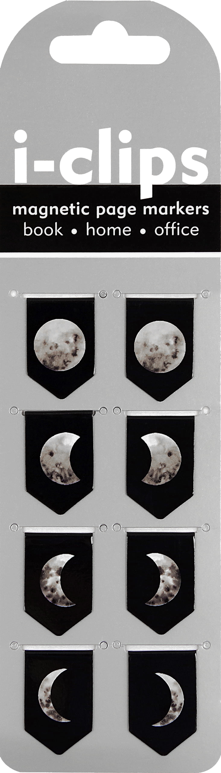 Let these Moon Phases i-clips eclipse your expectations in marking your place in books, documents, and more! Set features images of the moon in its different phases. 4 different pairs of magnetic page markers are included -- 8 in all! Multipurpose i-clips can be used as bookmarks, as well as magnets, paper clips, and more. Use the arrow on the back of each page marker to indicate where you left off. Set of 8 comes packaged in a transparent plastic sleeve that measures 2-1/2'' wide x 7'' high. Each page marker is 3/4'' x 1'' high folded. Warning: Choking hazard, small parts. Not for children under 3 years.