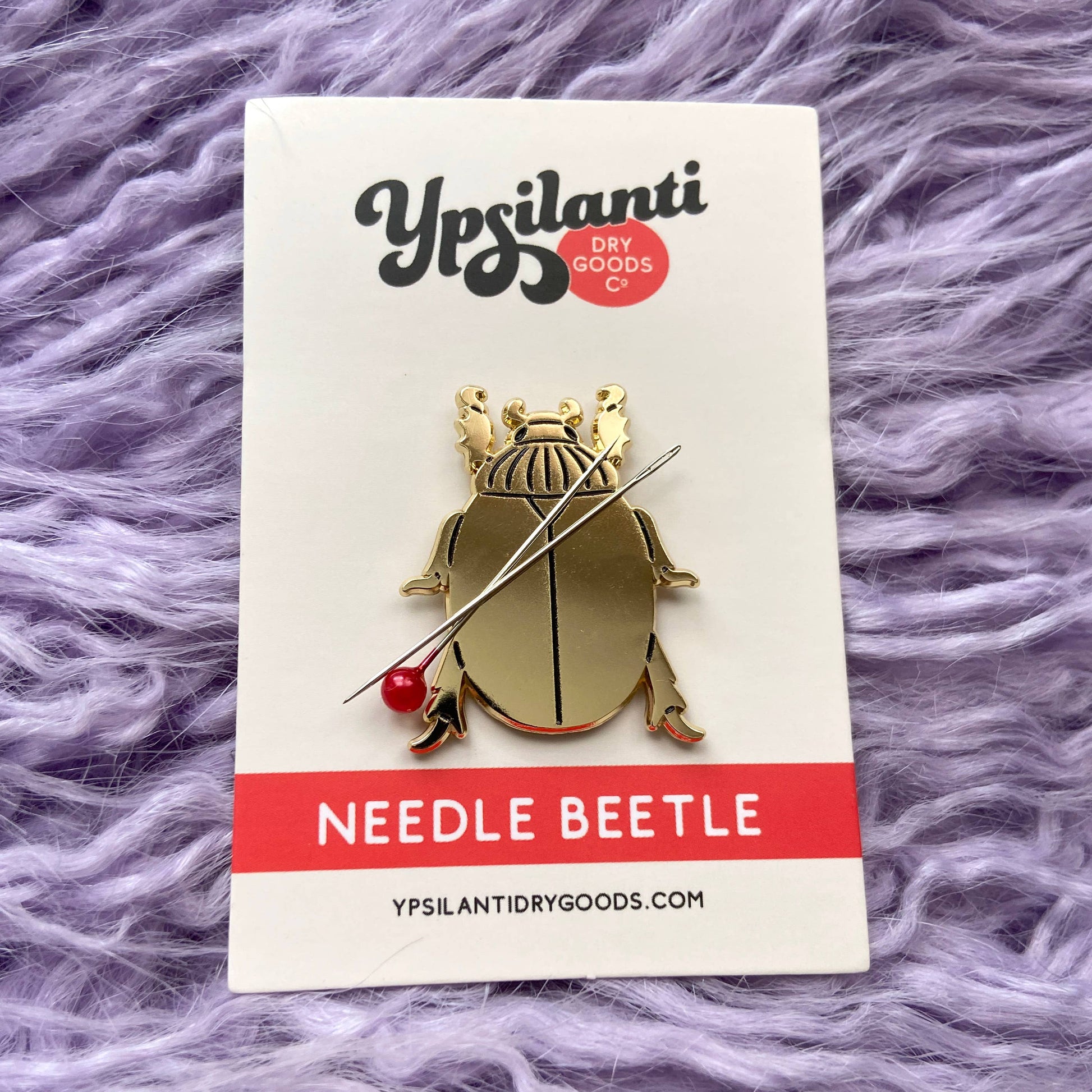 Meet the Needle Beetle! A magnetic buggy friend to help keep your pins and needles close at hand. With a strong magnetic backer, you can easily clip this guy onto your work in progress (or slap him on the fridge, why not) and he'll hold pins, needles, or other small metal items for ya.