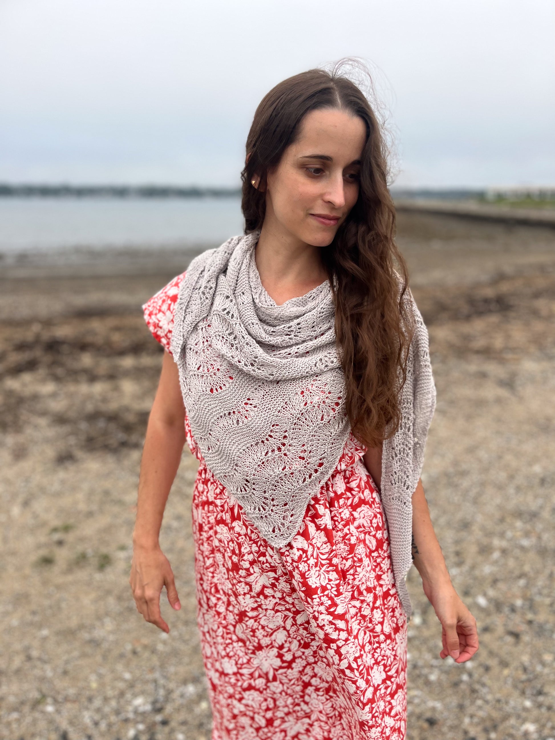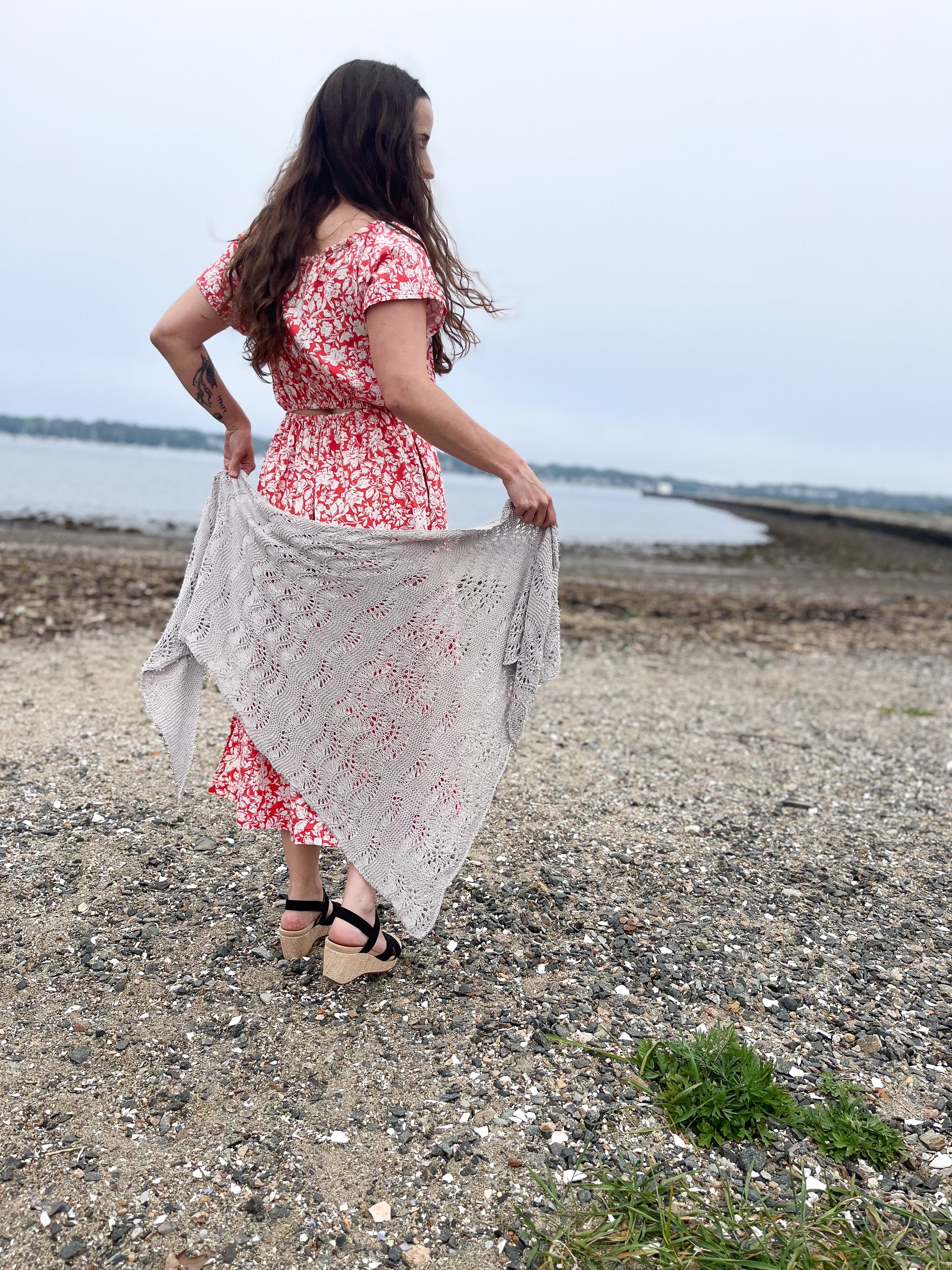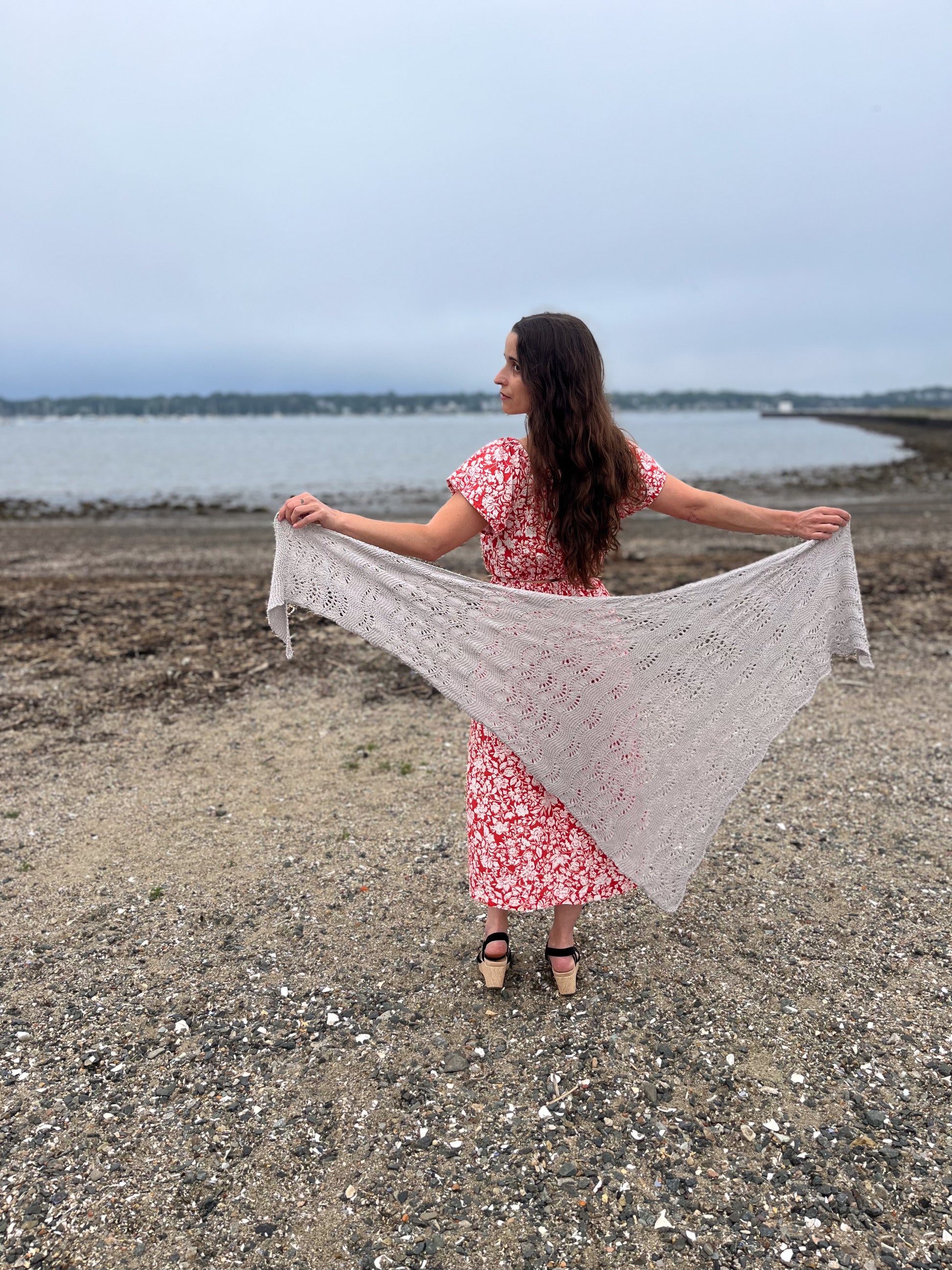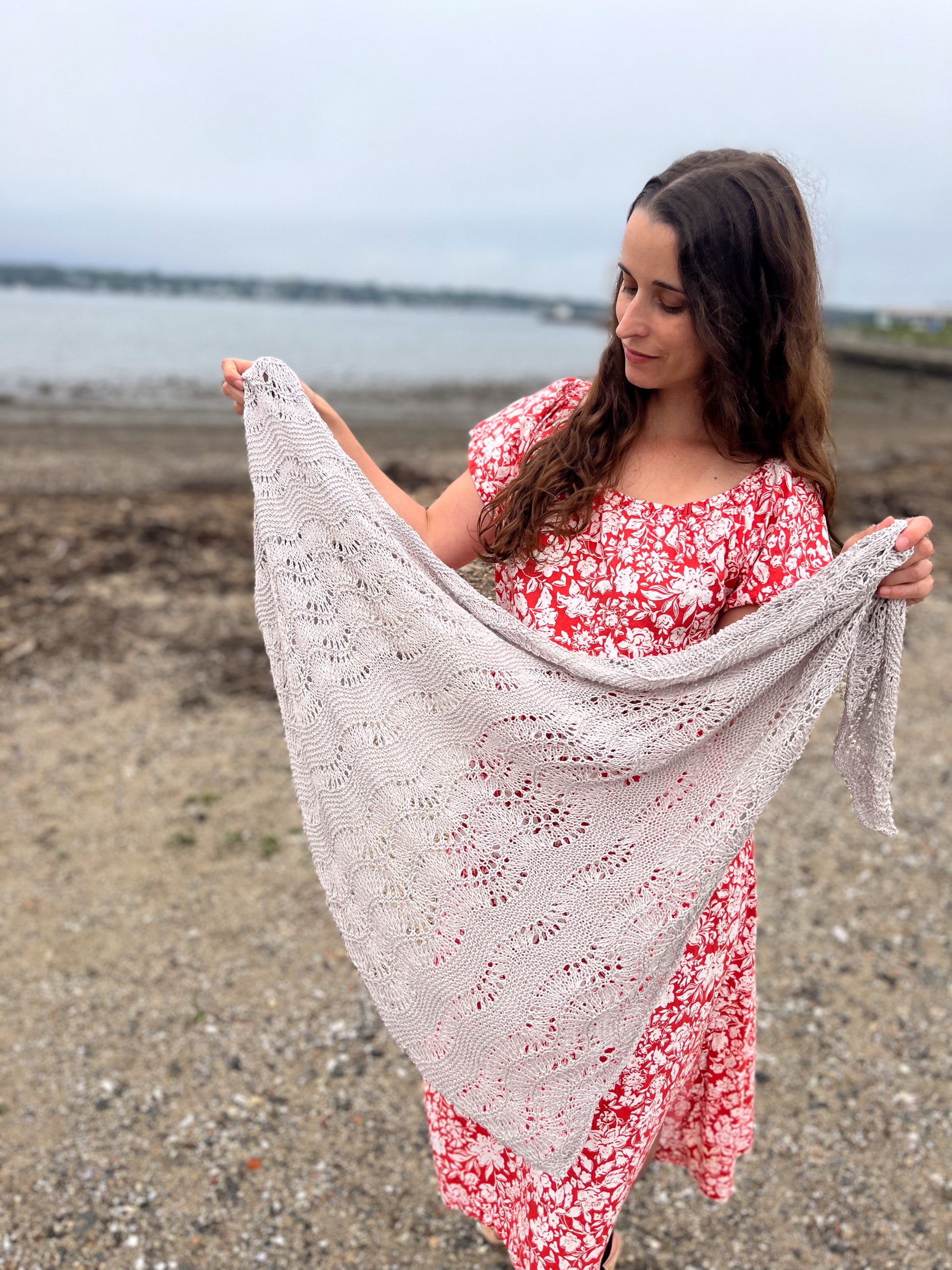‘Nevasca’ means snowstorm in my native tongue, Portuguese. This shawl is inspired by sweet childhood memories with my father, learning to ski and watching the patterns of fluffy snow drifting over the hills. The original Nevasca shawl is a super cozy DK weight winter shawl. Meet Nevasca Light, Nevasca’s sweet summer sister, knit in shimmery silk.