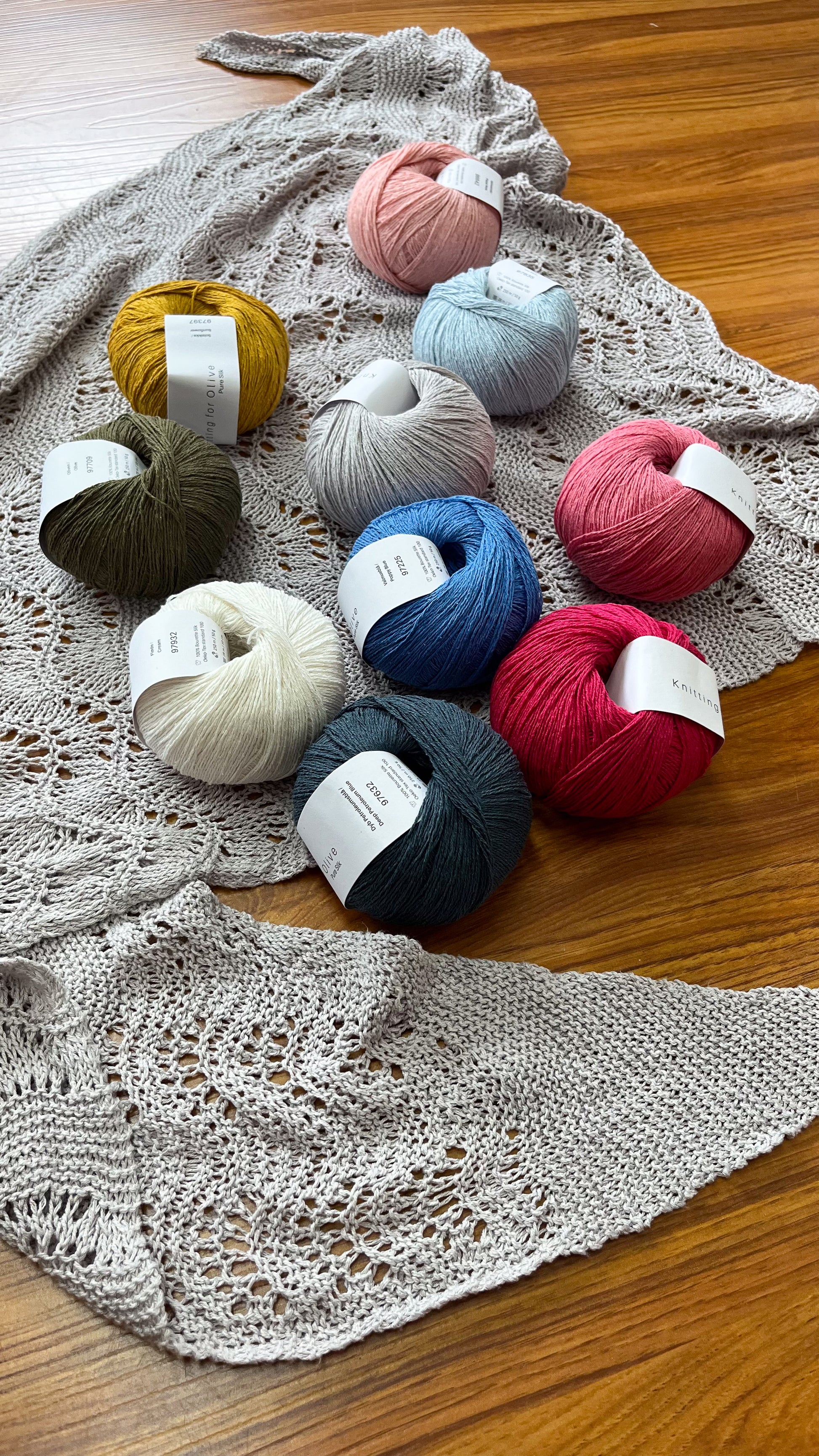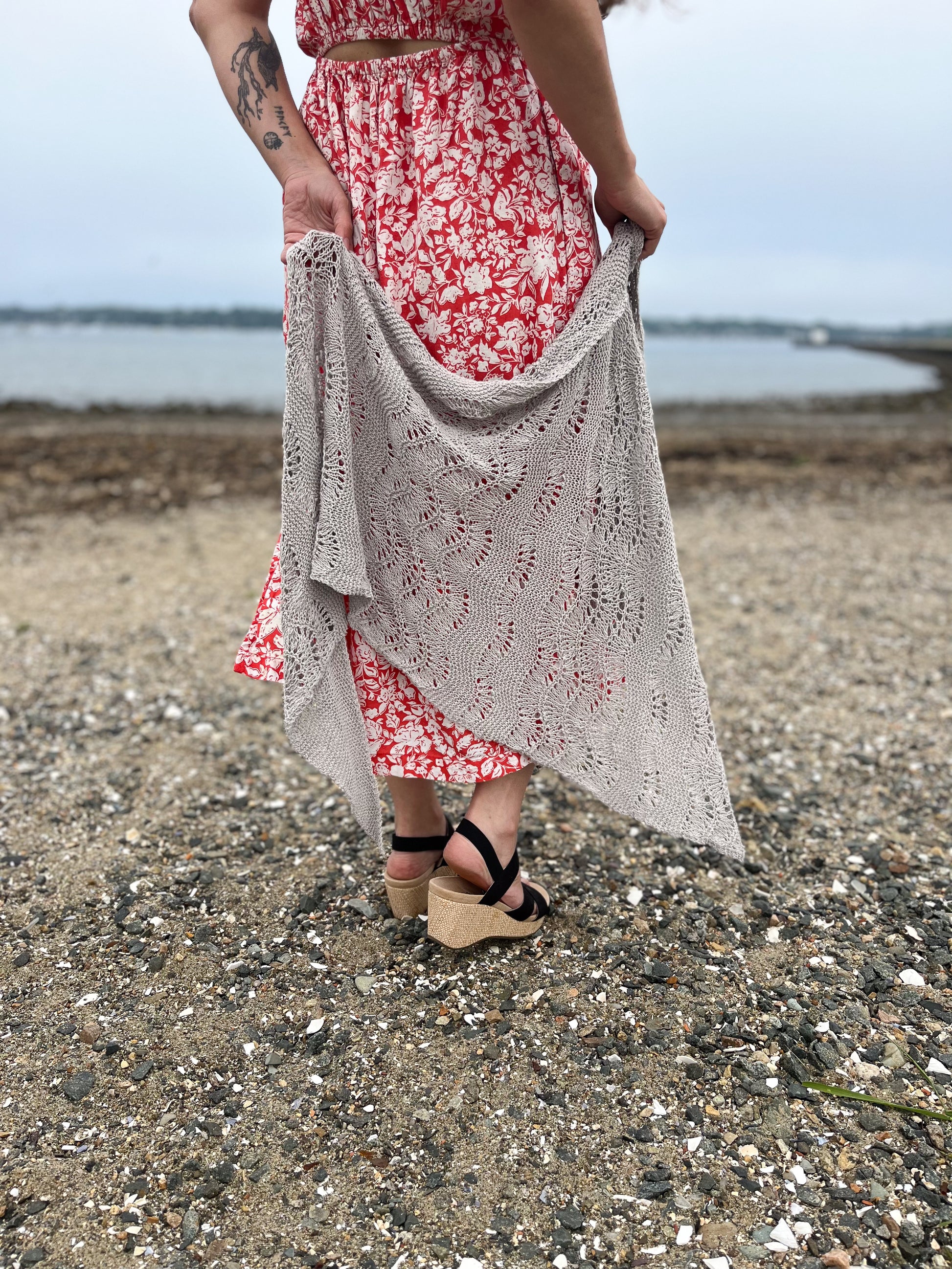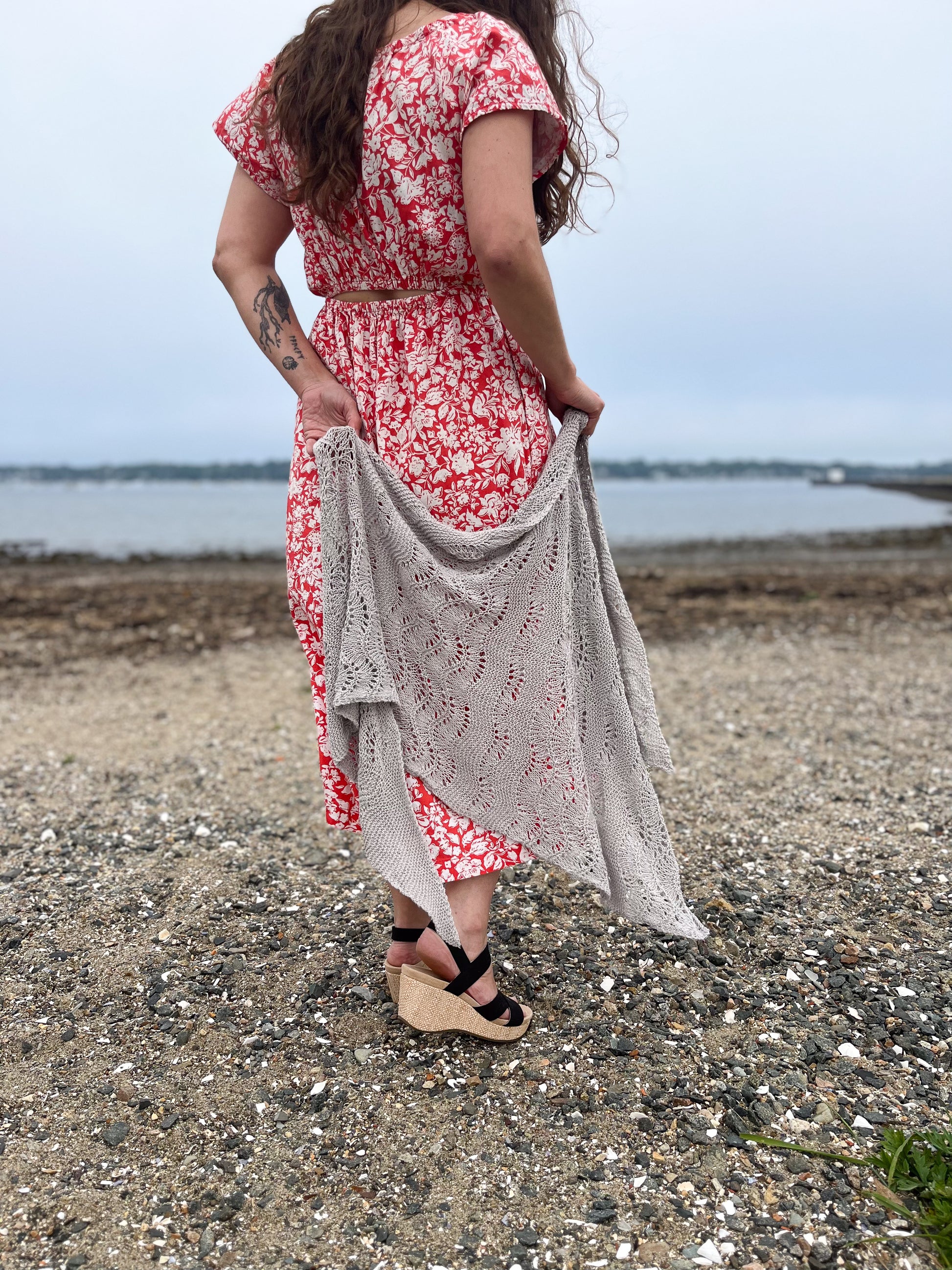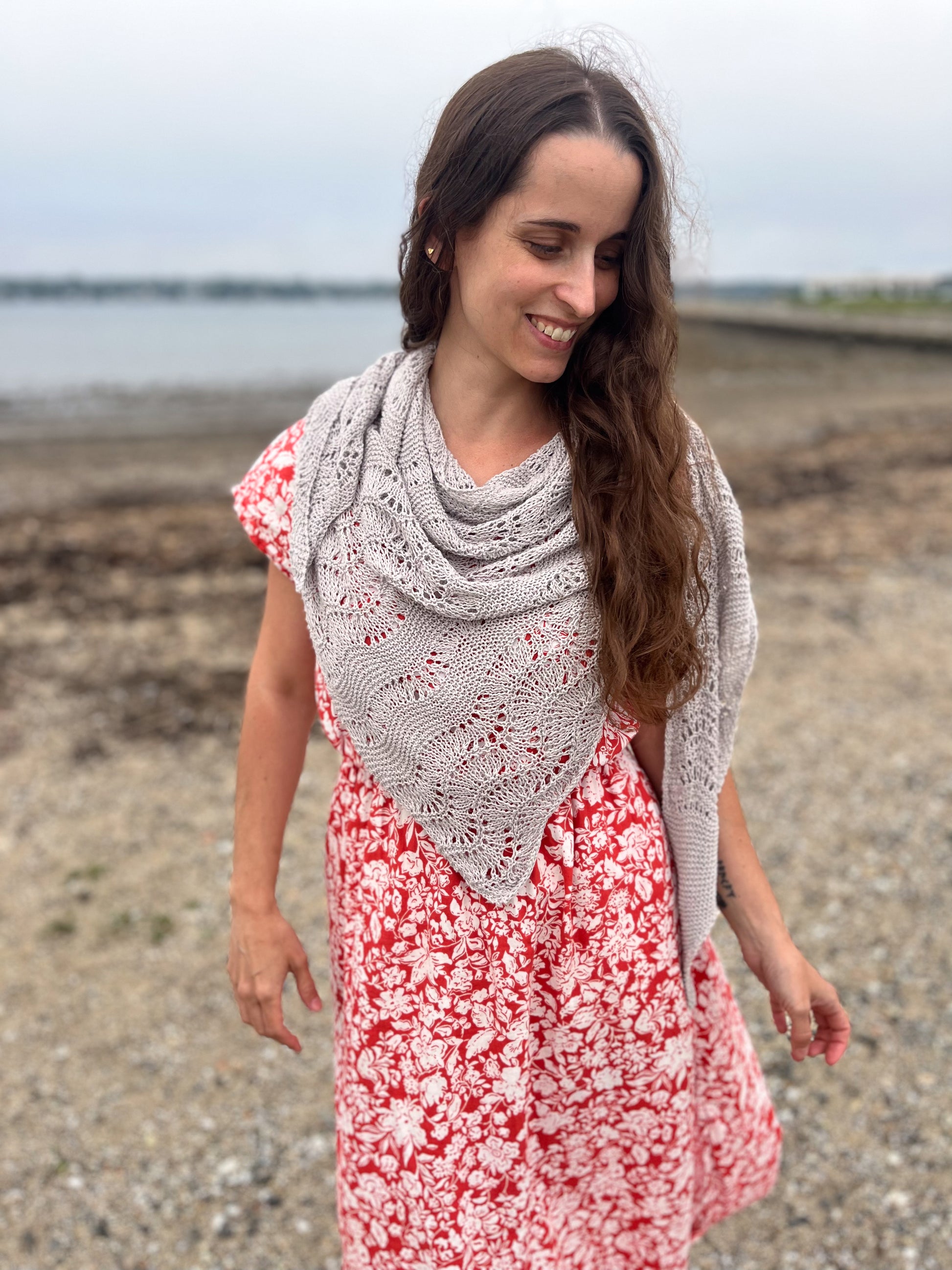 ‘Nevasca’ means snowstorm in my native tongue, Portuguese. This shawl is inspired by sweet childhood memories with my father, learning to ski and watching the patterns of fluffy snow drifting over the hills. The original Nevasca shawl is a super cozy DK weight winter shawl. Meet Nevasca Light, Nevasca’s sweet summer sister, knit in shimmery silk.
