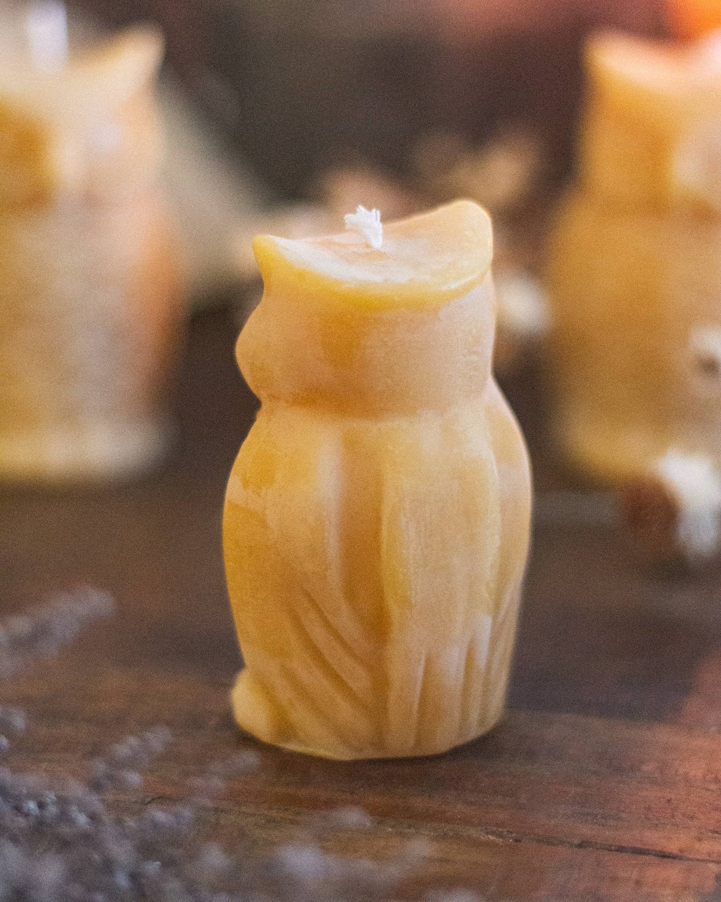 The owl stands about 3 inches tall and 1.5 inches across the base. Made of pure beeswax and cotton wick.
