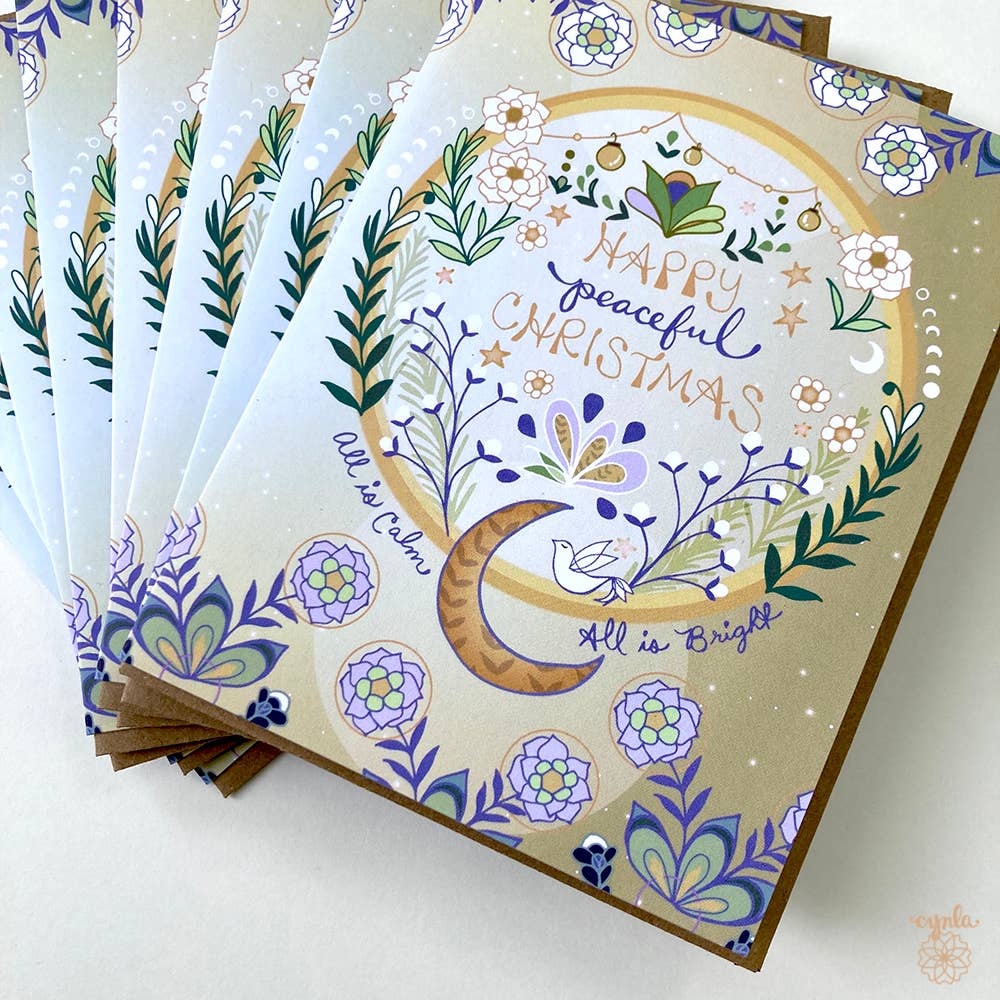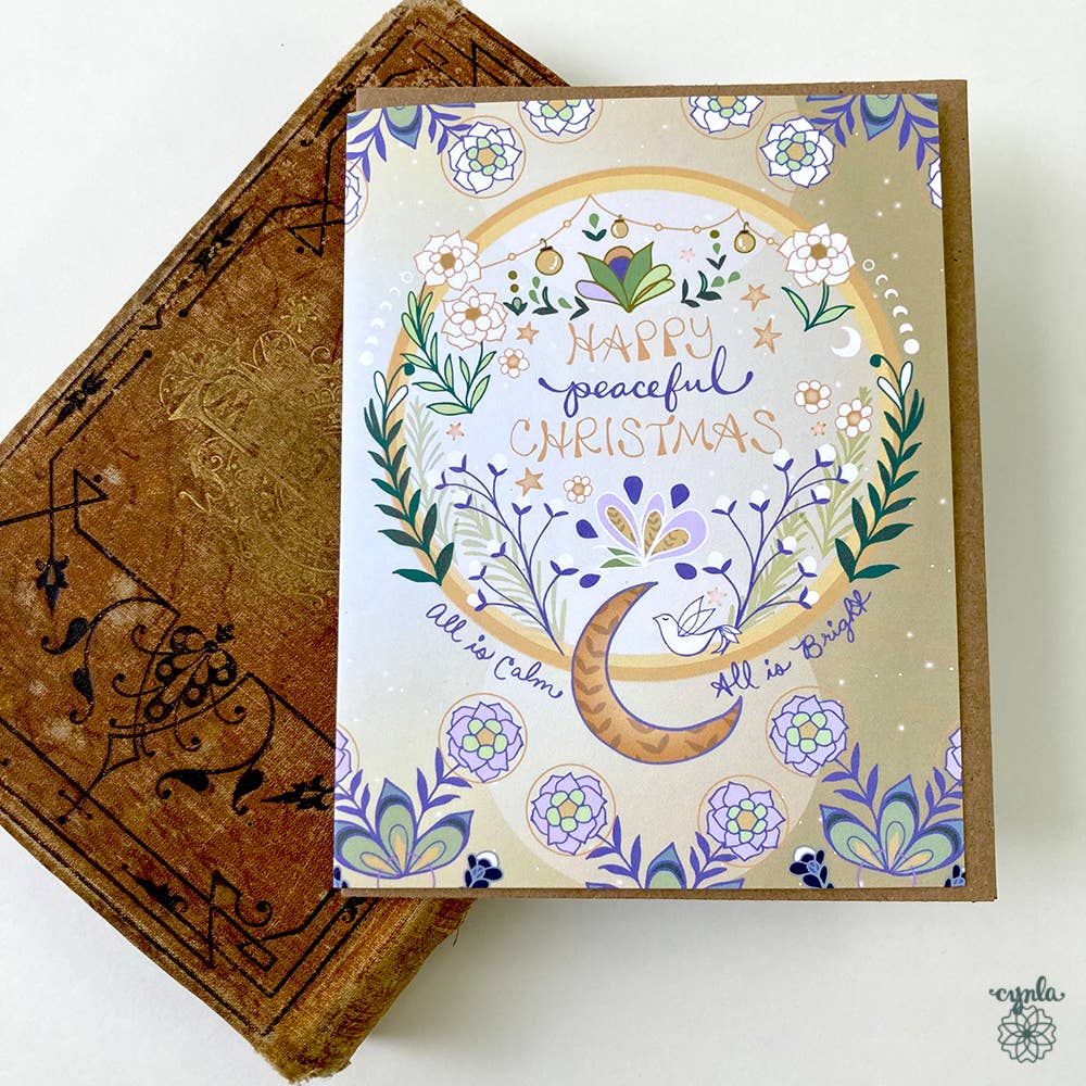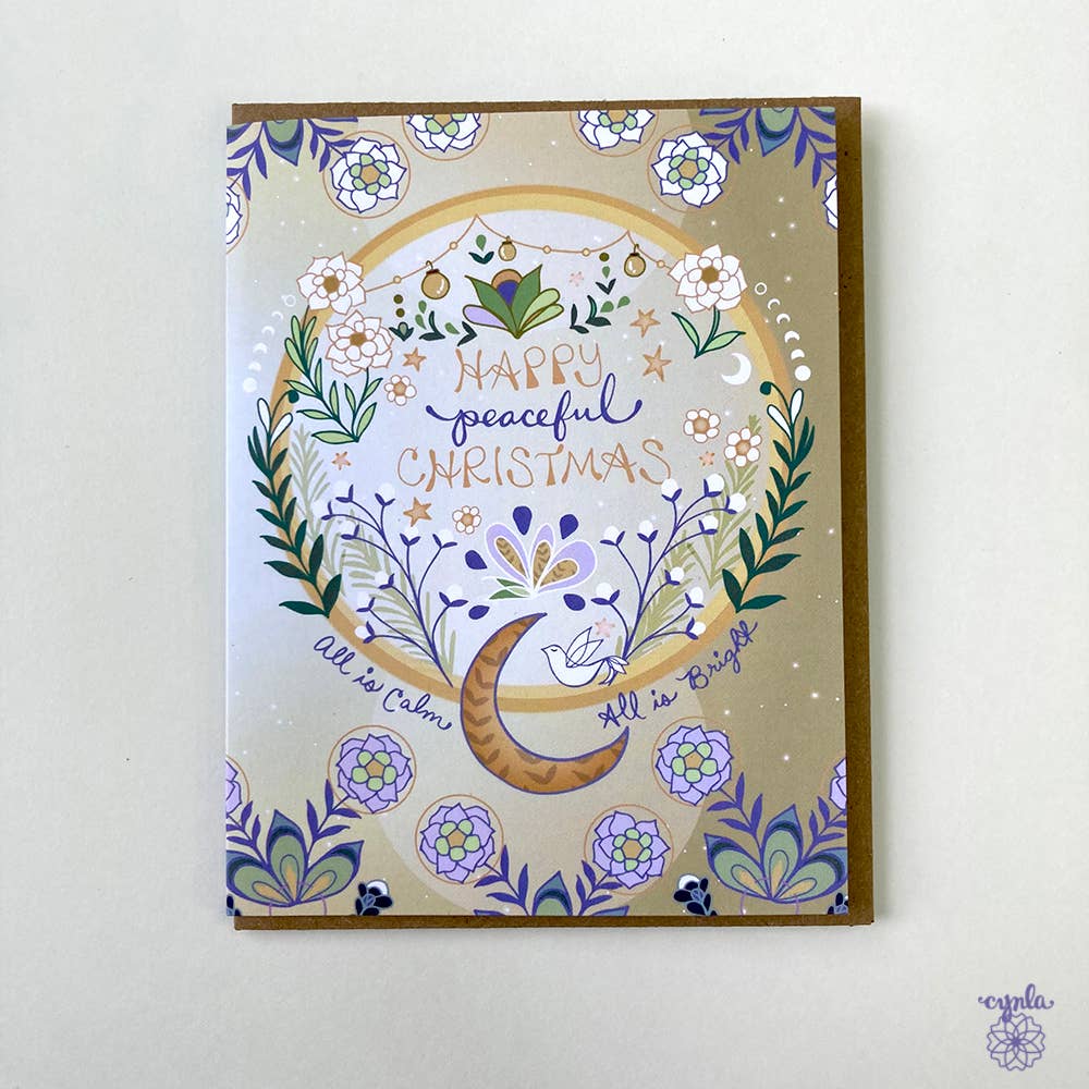 "Happy peaceful Christmas All is Calm, All is Bright" A golden, intricately designed card wishing for a peaceful Christmas