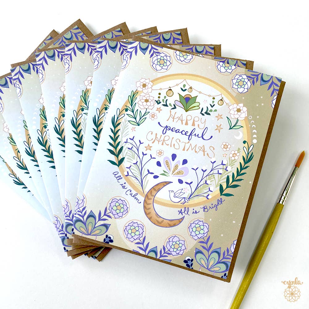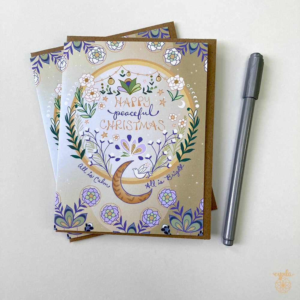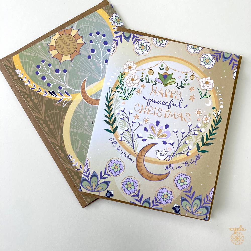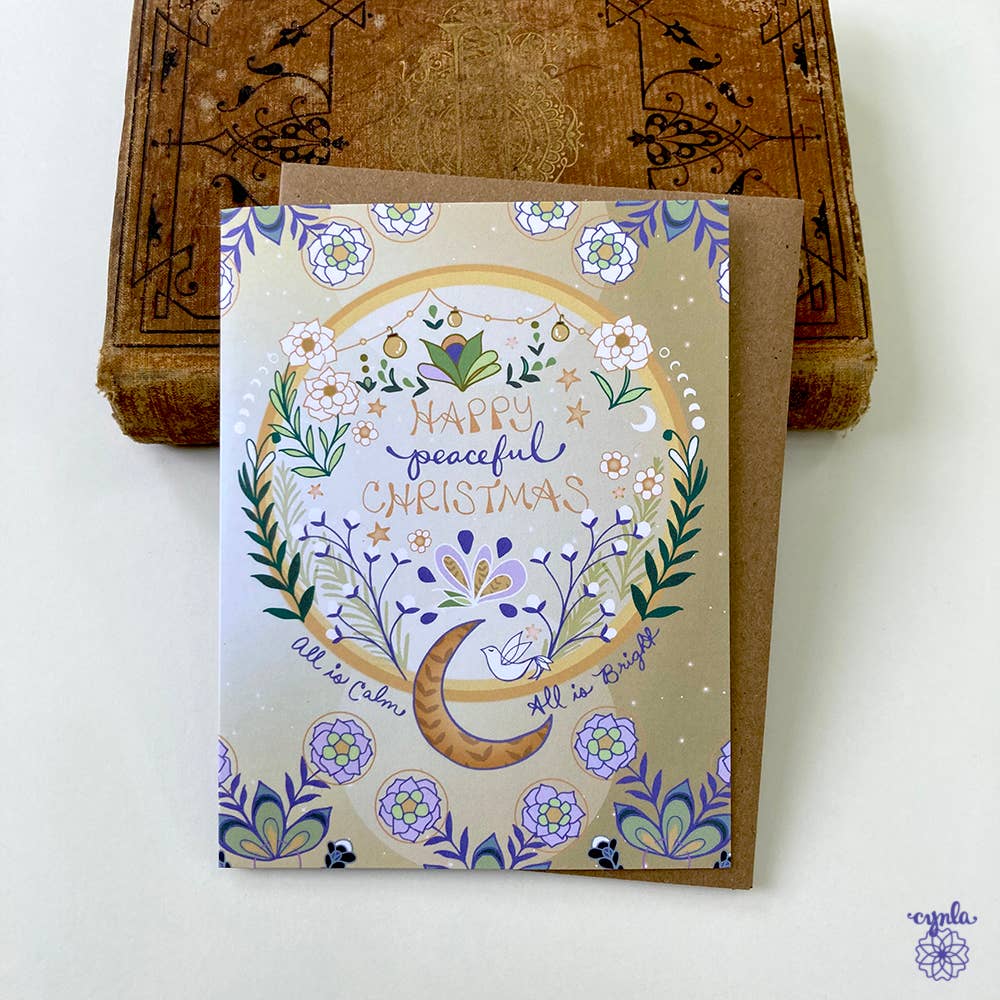 "Happy peaceful Christmas All is Calm, All is Bright" A golden, intricately designed card wishing for a peaceful Christmas