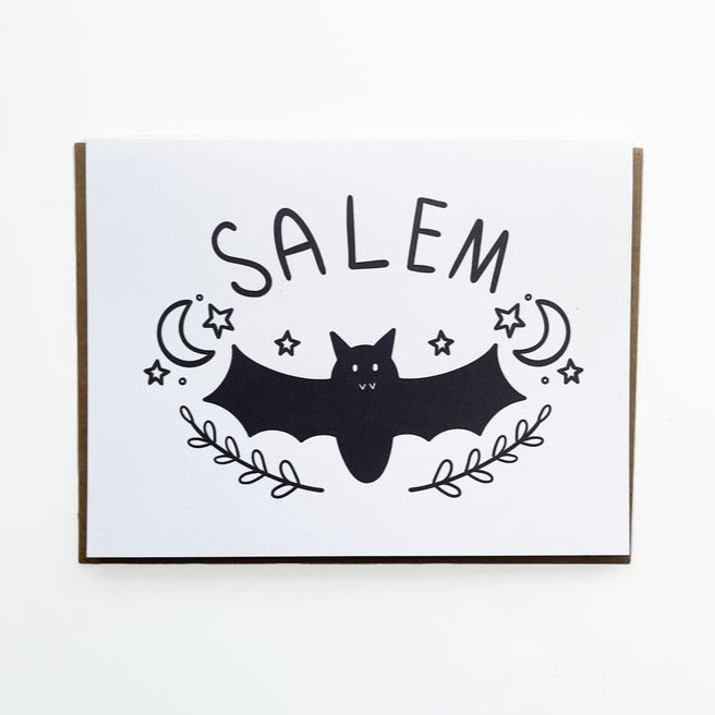 A blank Salem greeting card, illustrated with a cute bat by local artist Keegsie!