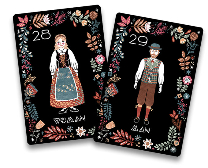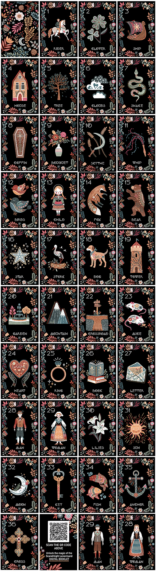 Vibrant hand-drawn Lenormand card deck with 38 illustrated cards, inspired by scandinavian folklore with a modern twist