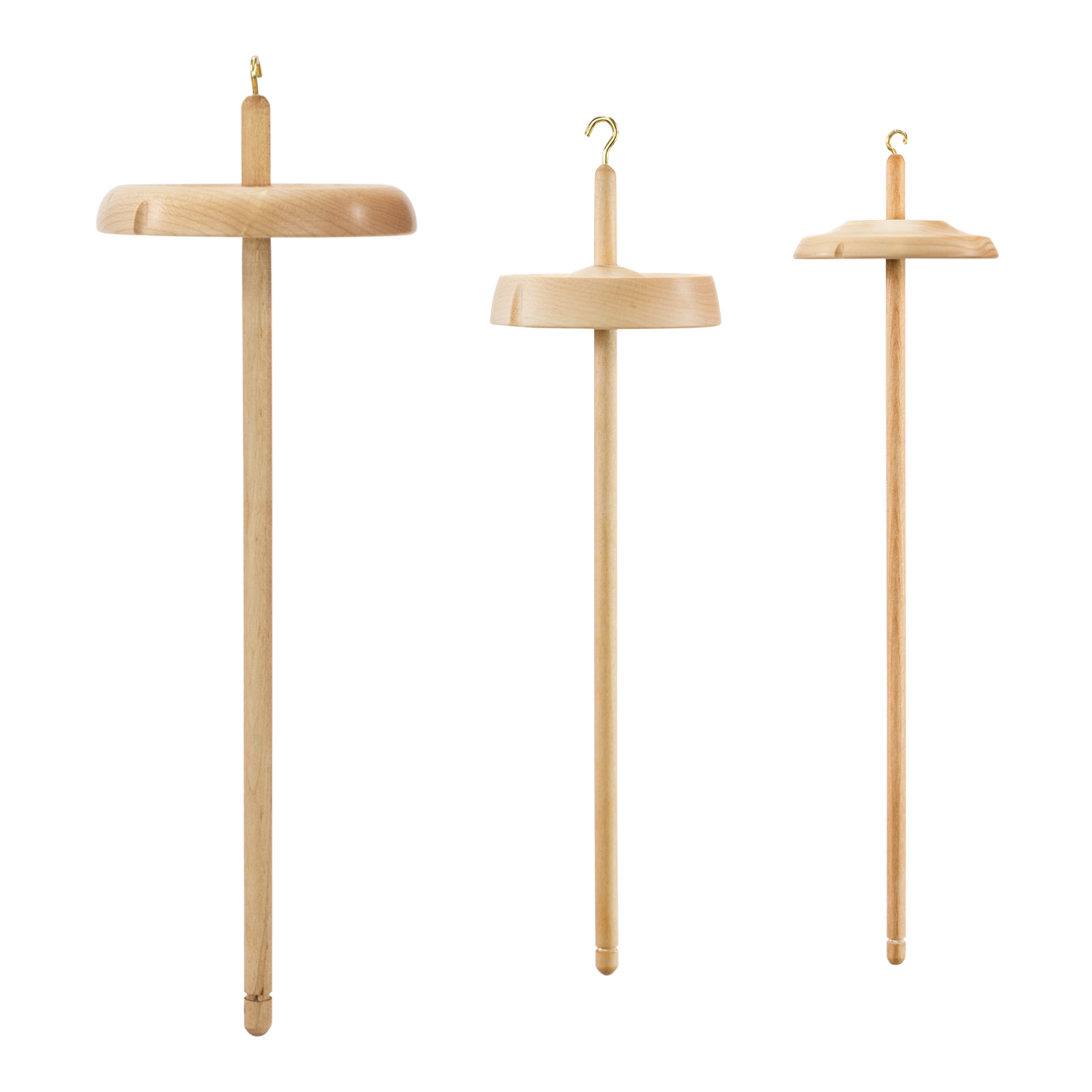 Schacht Hi-Lo Spindles offer the best of both whorls for drop spindles: a brass hook at the top for high-whorl spinning and a grooved shaft for low-whorl spinning. Three sizes offer a broad spectrum of spinning capabilities: 2" (1 ounce), 3" (1.8 ounces), and 4" (2.7 ounces). The spindles are made of hard maple.