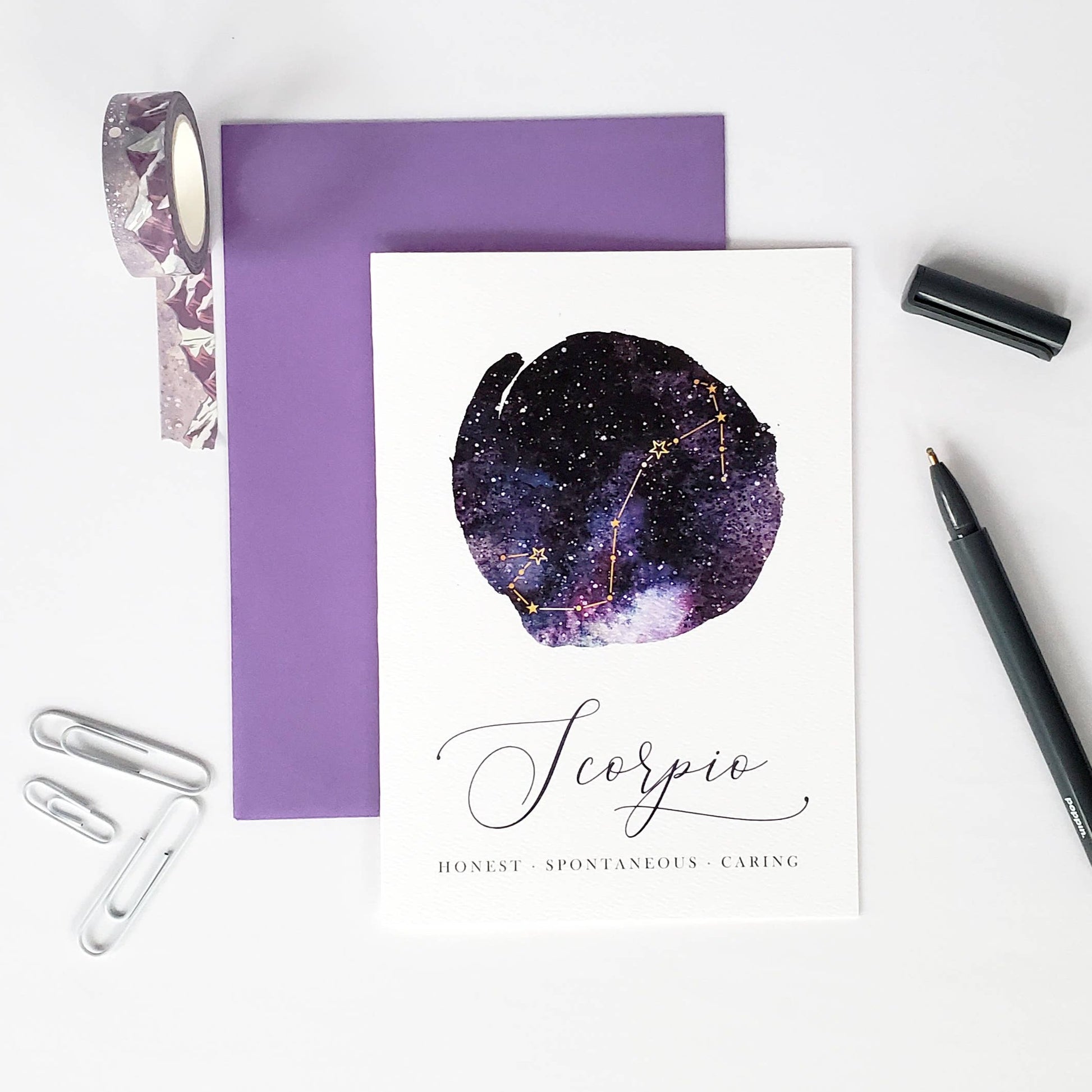 The perfect astrology birthday card for the Scorpio in your life. Lucky Dog cards are hand-folded and printed on thick, felt-textured stock to create a unique and memorable stationery experience.