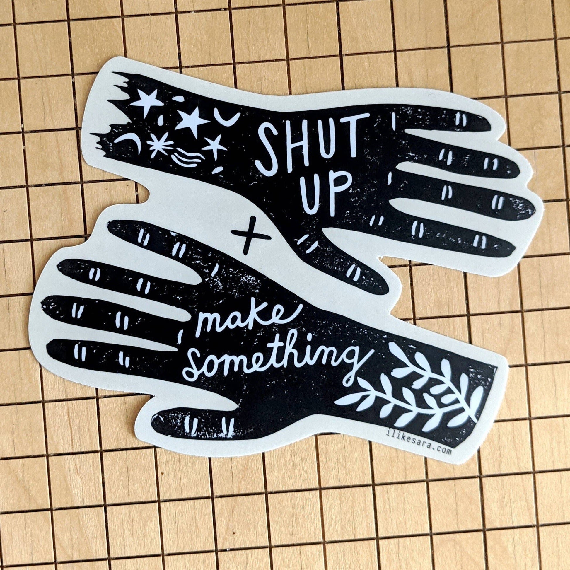 Shut up and make something! Whether this is a good reminder for you or your personal motto that you want to shout from the rooftops, this sticker is sure to get you makin'!