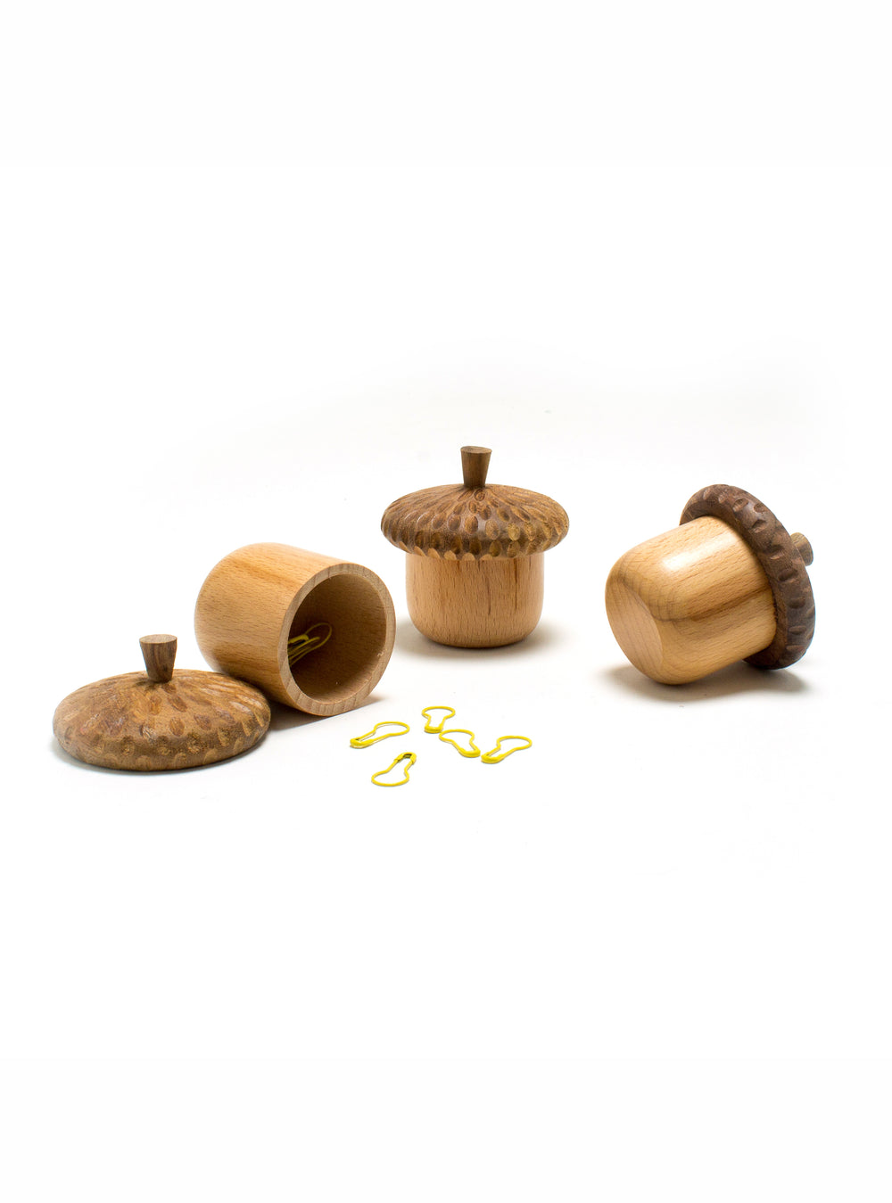 A sweet wooden acorn jar to hold your stitch markers, buttons, or other knitting doodads.