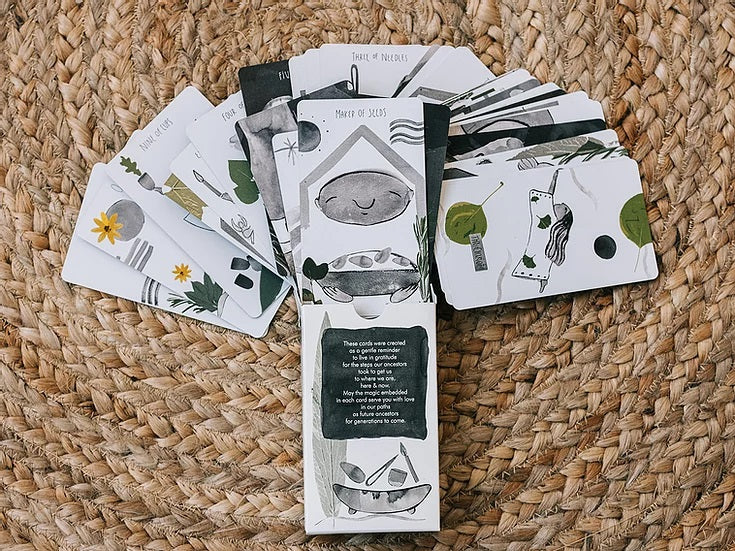Each card was collaged using sumi ink and pieces of nature that surrounds her home on Coast Salish land, also known as Seattle, Washington. These cards are a gentle reminder to live in gratitude for the steps our ancestors took to get us to where we are, here & now.