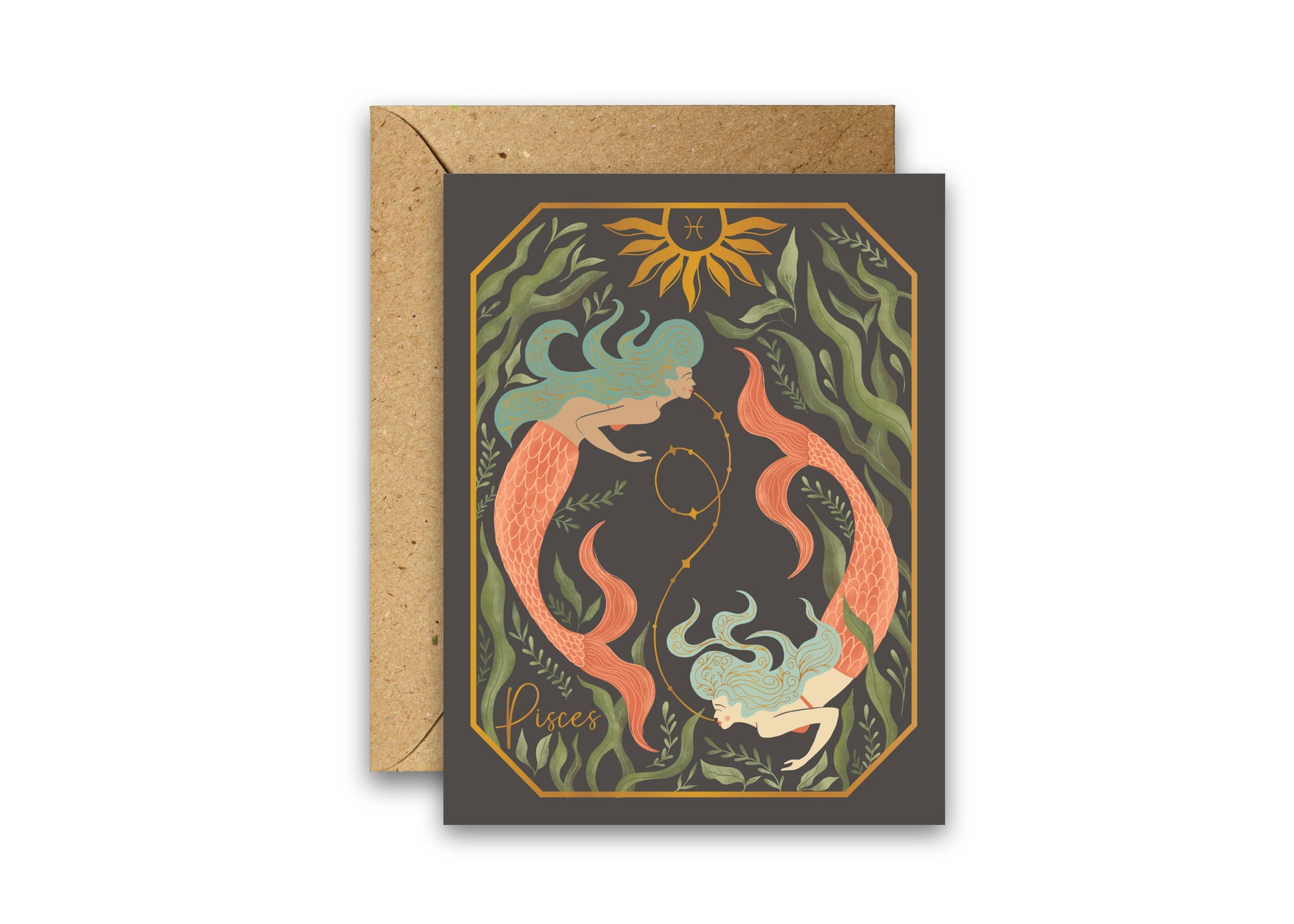 The mystical Pisces Zodiac Garden Gold Foil Greeting Card features two mesmerising mermaids with blue hair and coral fins among green leaves with gold foil highlights.
