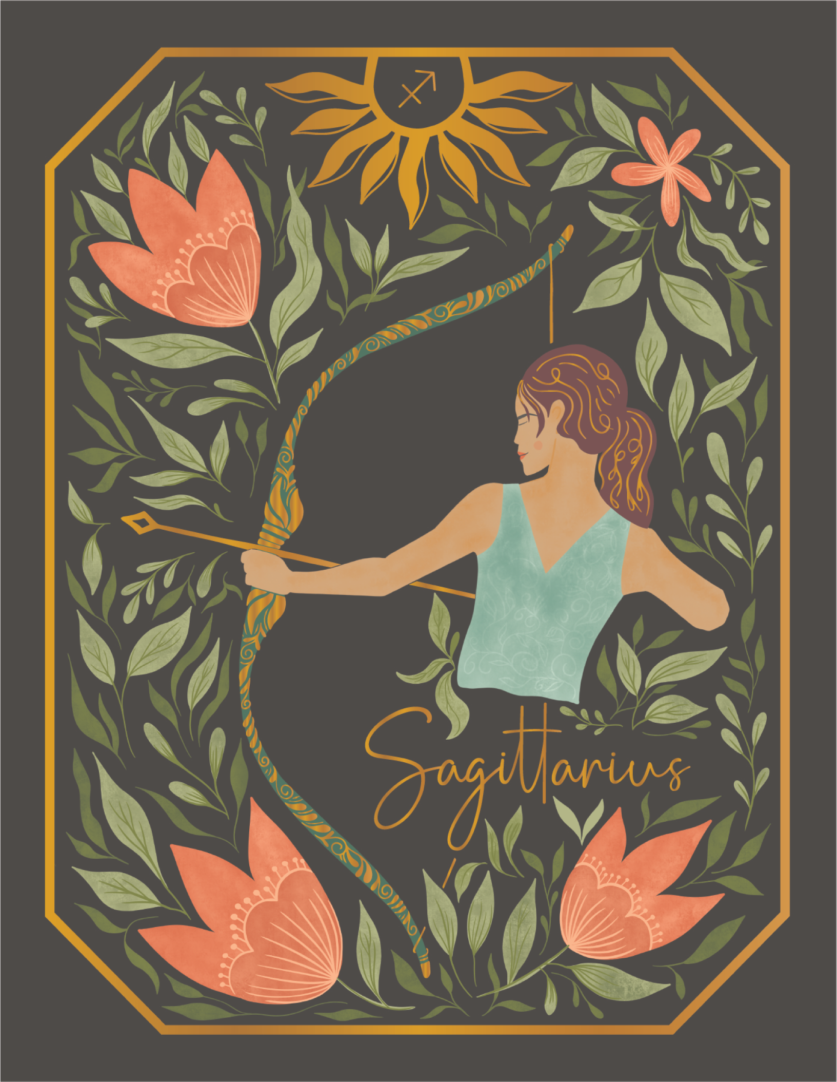 This card depicts a female archer surrounded by coral flowers and green leaves, detailed with a gold foil bow and arrow.