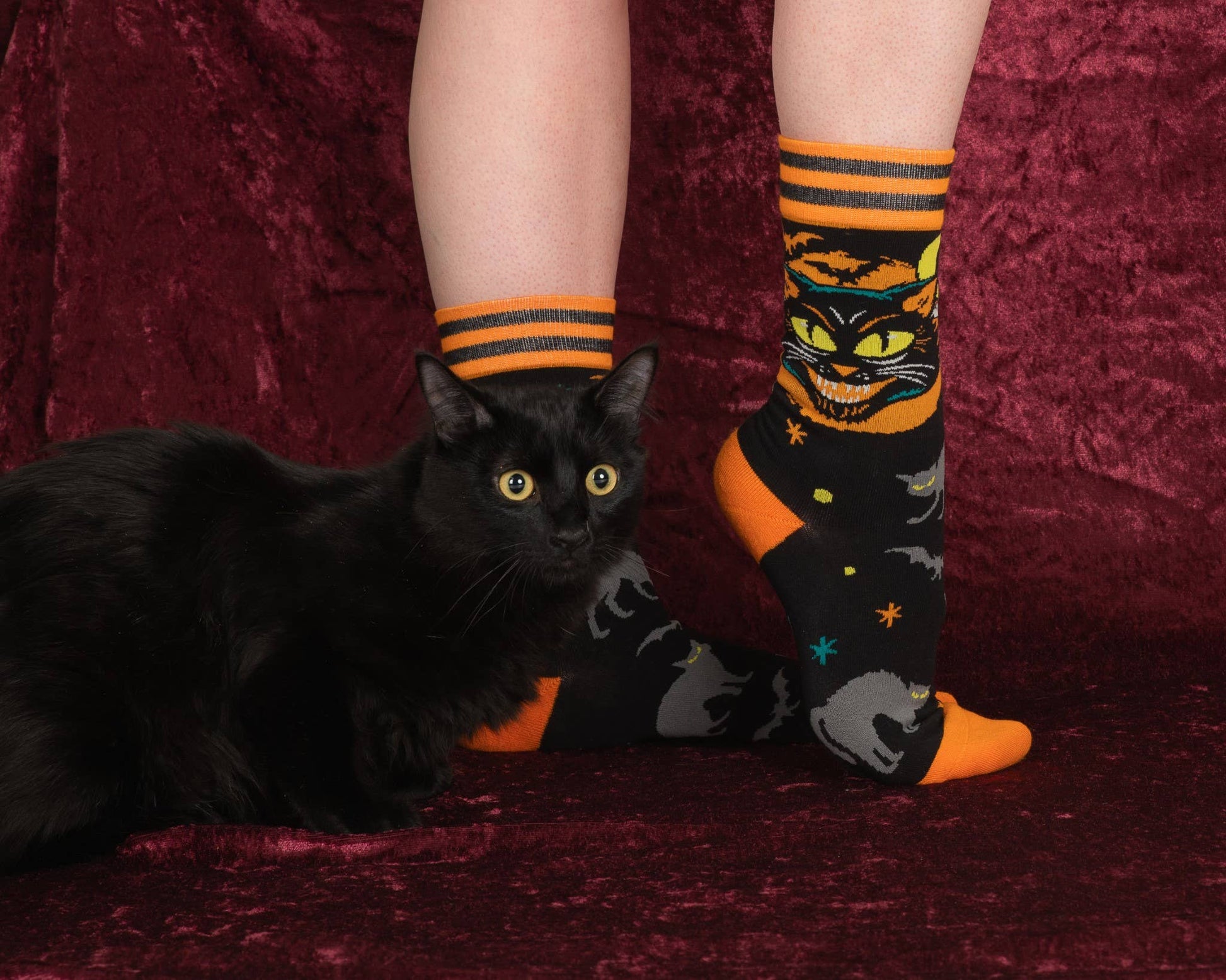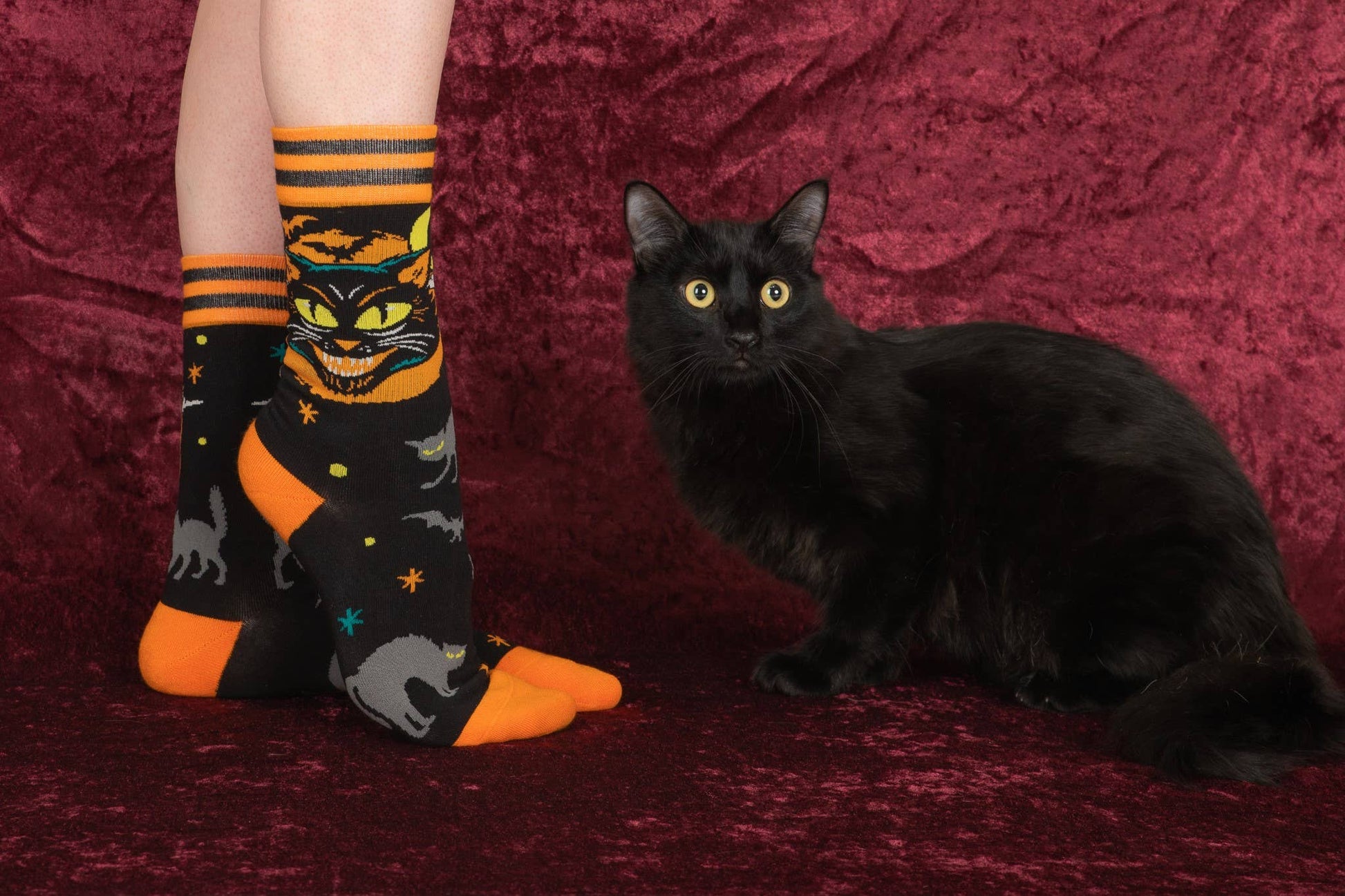 Celebrate Halloween year round with these purrfectly cute vintage-inspired black cat crew socks. Best when worn while walking under ladders.